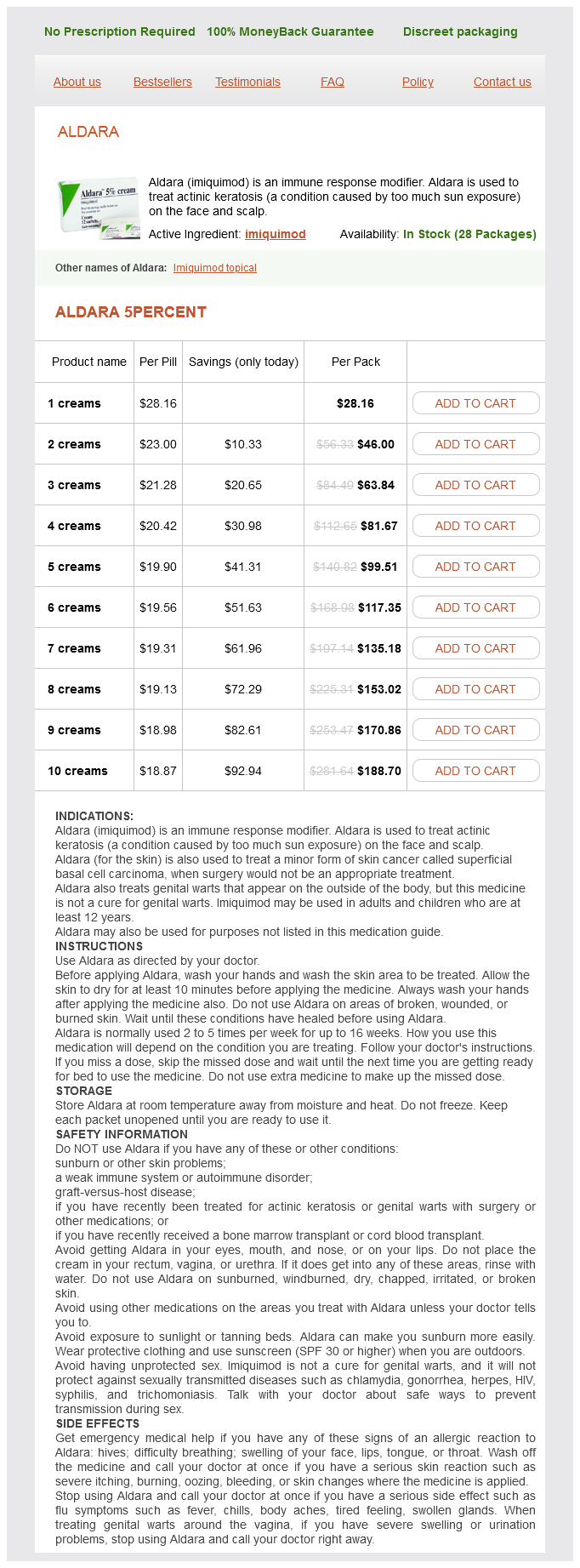 Aldara is a prescription medication and may only be used beneath the steerage of a healthcare skilled. Before utilizing Aldara, it's essential to disclose any medical conditions or allergic reactions to your doctor to make sure the secure use of this medication. In most circumstances, Aldara must be used for about two to 6 weeks, depending on the severity of the situation being handled. The cream should be utilized to the pores and skin thrice per week, for 8-10 hours each time, after which washed off. It is important to comply with the directions provided by your doctor carefully and to not use more or less than the prescribed quantity.
