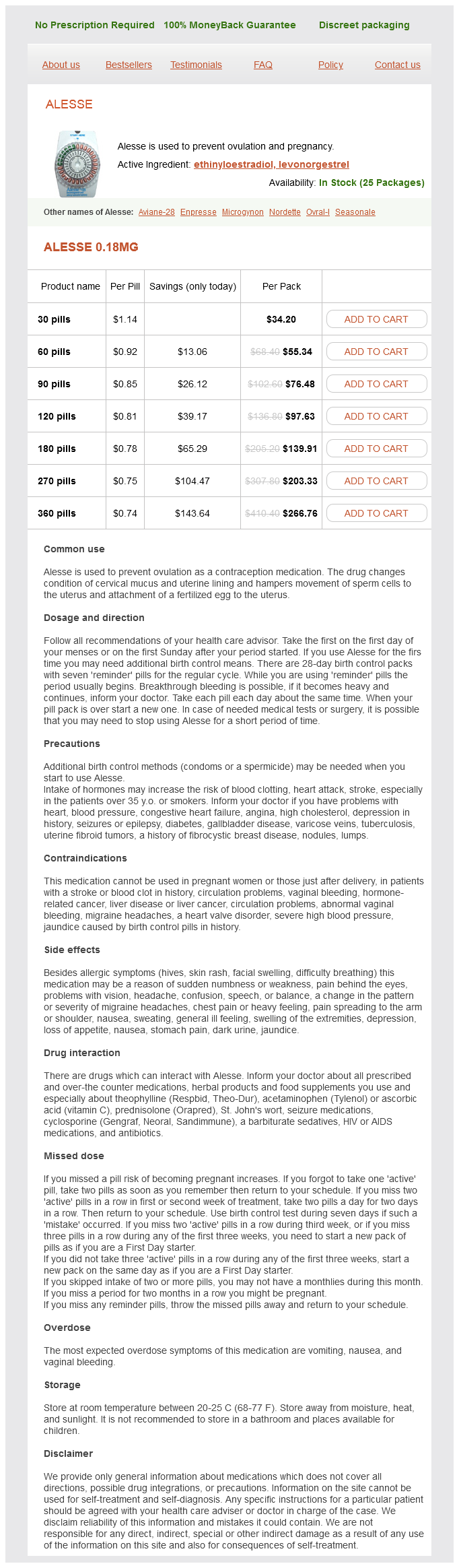 As with any treatment, there are certain precautions to be taken while using Alesse. It is not beneficial for ladies who are over 35 years old and smoke because it might increase their danger of growing blood clots. Women with a history of blood clots, coronary heart illness, or stroke are additionally suggested towards using Alesse. It's essential to disclose your medical historical past and any drugs you are at present taking to your doctor earlier than beginning Alesse to ensure its security for you.
