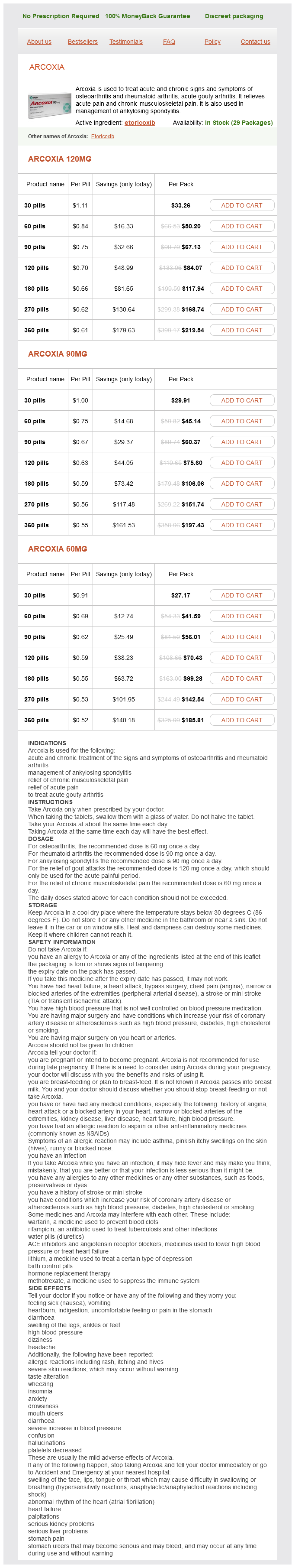 Not only is Arcoxia effective in treating numerous forms of arthritis, but additionally it is used for the relief of acute and chronic musculoskeletal pain. This contains ache attributable to injuries, surgeries, and other conditions that have an effect on the muscular tissues, joints, and bones. Arcoxia could be prescribed by a physician for short-term ache relief or for long-term administration of chronic ache, relying on the individual's particular needs.