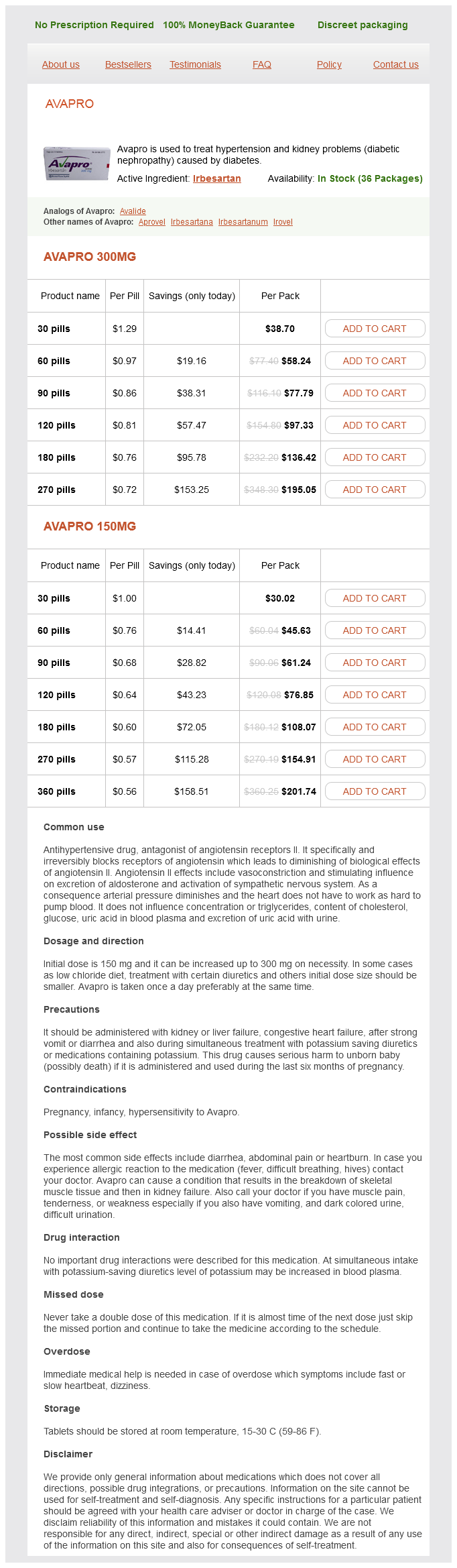 In conclusion, Avapro is a extensively used treatment for the therapy of hypertension and diabetic nephropathy. It works by enjoyable blood vessels and enhancing kidney operate, thereby lowering the risk of serious health issues. As with any treatment, it is crucial to comply with the prescribed dosage and seek the assistance of a healthcare provider for any considerations or potential interactions. With correct use, Avapro can help individuals manage their conditions and improve their overall health and well-being.
