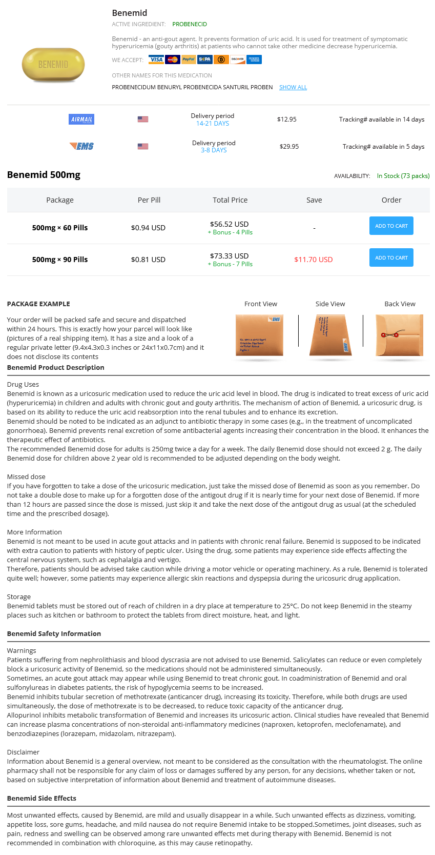Benemid is out there in both pill and injectable type. The recommended dose is usually 250 mg twice a day, though this may range relying on the severity of the condition and response to therapy. It is important to notice that whereas Benemid can help decrease uric acid ranges, it does not provide instant reduction from gout signs. Therefore, different medications might need to be prescribed for acute relief throughout gout attacks.