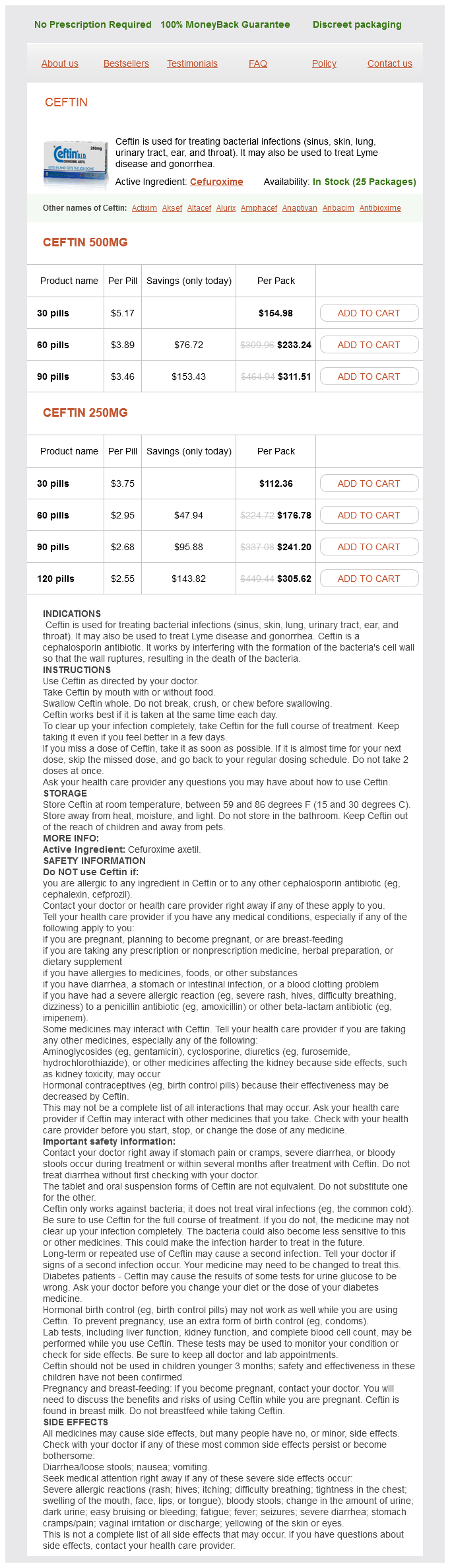 As with any medication, there are some precautions that have to be taken whereas using Ceftin. It is essential to disclose any known allergy symptoms or other underlying medical circumstances to the prescribing doctor to avoid any adverse reactions. Pregnant or lactating women also wants to seek the guidance of their doctor before taking Ceftin. Additionally, it is crucial to complete the total course of antibiotics prescribed, even if you begin feeling higher after a couple of days. Stopping the medication prematurely might result in the formation of antibiotic-resistant bacteria, making it more difficult to treat the infection in the future.