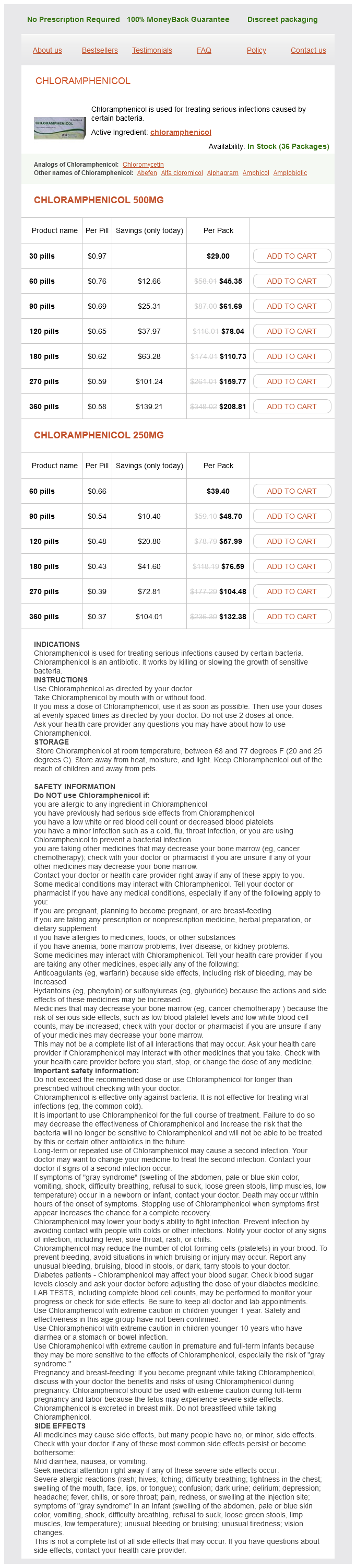 Chloramphenicol shouldn't be utilized in sufferers with a historical past of blood disorders, liver illness, or kidney problems. It can also be necessary to inform your doctor of any medicines you are at present taking, including over-the-counter medication and natural dietary supplements, as they may work together with chloramphenicol.