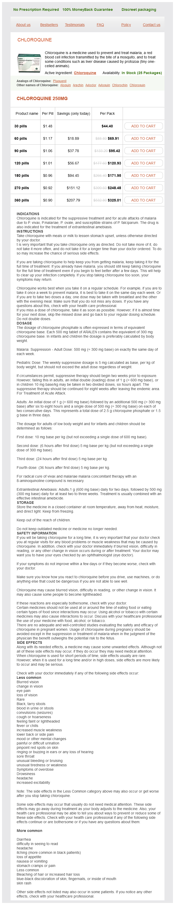 At the conclusion of this course symptoms joint pain fatigue purchase chloroquine overnight, you should be able to accurately perform basic arithmetic calculations, relate the equivalents for the metric system, and accurately calculate oral, parenteral and intravenous dosages using ration and proportion, including for pediatric dosages that are based on body weight. The materials presented in this course are meant to provide the consumer with general information on the topics covered. The information provided was prepared by professionals with practical knowledge in the areas covered. Participants must participate in the entire presentation and complete the course evaluation to receive continuing pharmacy education credit. Learning objectives Describe the members of the Arizona Board of Pharmacy, including how many there are, their qualifications, and how they become eligible for board appointment. List the types of prescribers who may prescribe medications in the state of Arizona and any restrictions on their prescribing authority. Discuss requirements for filling prescriptions in Arizona, including requirements for filling prescriptions written by Mexican and Canadian prescribers. Explain generic substitution requirements in Arizona and when it is appropriate to dispense a generic medication. Describe the valid time frame for dispensing refills of medications in Arizona, including refills and time frame restrictions on controlled substances. Discuss the regulations on the dispensing of controlled substances without a prescription, including quantity limits and record keeping. Describe the requirements for the sale of pseudoephedrine, including quantity limits and record keeping. Describe prescription transfer regulations and what information must be recorded during a prescription transfer. Describe the licensing requirements for pharmacies and the types of permits that may be issued by the Arizona Board of Pharmacy, as well as renewal requirements. Discuss the responsibilities of pharmacy interns and their licensing requirements. Discuss the responsibilities of pharmacy technicians and their licensing and continuing education requirements. Describe regulations on immunization by pharmacists, including the certification process and who can be immunized. List the vaccines that require a prescription to be administered to an adult patient. Introduction State laws and regulations governing pharmacy practice are extremely important in the day-to-day work of a pharmacy associate. From the license needed to work in the pharmacy to the floor space necessary for each employee, laws and regulations govern every aspect of daily pharmacy operation. As a pharmacy employee, it is imperative to maintain a working Page 1 knowledge of state pharmacy laws, and continue to learn about new laws that have been passed as well. All states have variations in their state pharmacy laws that distinguish them from other states. While state laws in Arizona are similar to others, there are significant differences that must also be reviewed. Remember that laws may change, and be sure to consult the Arizona State Law Book for a thorough explanation of each law. This course is an overview of the pertinent Arizona state laws, and may not be all-inclusive see the law book for full details. Arizona State Board of Pharmacy the Arizona State Board of Pharmacy is the governing body for pharmacy affairs in the state of Arizona, and is also responsible for issuing licenses to pharmacists, interns, technicians, pharmacies, drug wholesalers, and drug manufacturers. The board consists of nine members: six pharmacists, one pharmacy technician, and two members of the public. The pharmacists who are members of the Board of Pharmacy must have at least 10 years of experience before they are eligible for appointment, and at least five years of experience as a licensed pharmacist in Arizona. Pharmacist members must have been a resident of Arizona for the five years preceding appointment. There must be at least one actively practicing community pharmacist, and at least one pharmacist actively working at a licensed hospital. The pharmacy technician member of the Board of Pharmacy must have at least five years of experience actively working in a pharmacy, and must have been a resident of Arizona for the five-year period preceding appointment. The two public members also are required to have residency status in Arizona for the five years preceding their appointment, and may serve a five-year term unless they are removed by the governor. The president must be present at all board meetings; the vice-president may act in place of the president if the president is not present. The Board of Pharmacy must hold at least four meetings per year and provide an annual report to the governor, including the names of all persons and facilities licensed by the Board of Pharmacy. The Board of Pharmacy is responsible for developing and maintaining laws and rules to protect the public on any issue related to pharmacies, pharmacists, pharmacy technicians, the storage, distribution or manufacture of medications, and the practice of pharmacy. To properly enforce pharmacy rules and laws, the Board of Pharmacy or its designated employees have the right to enter any pharmacy, manufacturing plant, wholesaler, storage facility, or vehicle used in the manufacture, storage, or sale of prescription medications. Inspections can be conducted at any time the facility in question is open, and prior notice is not required. The Board of Pharmacy is also responsible for providing notice at least once every three months of any changes to prescribing authority of any prescriber licensed to practice in Arizona. Pharmacy setup and security Pharmacies in Arizona must have a dispensing, compounding, and drug stocking area that is at least 300 feet. This is to allow pharmacists adequate space to monitor the activities of pharmacy personnel and ensure efficient workflow. Each employ