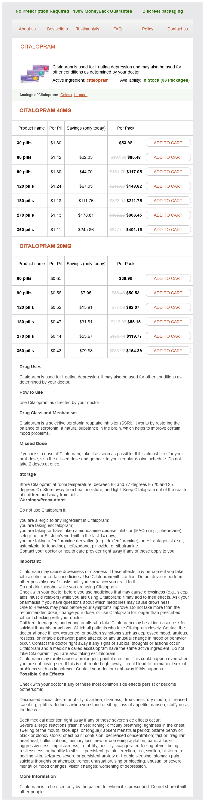 The primary use of citalopram is for the remedy of depression. It is FDA-approved for adults over the age of 18, and has been shown to be efficient in managing signs of major depressive dysfunction. It can also be used off-label for other mood problems corresponding to bipolar disorder, anxiousness problems, and obsessive-compulsive disorder. In some instances, citalopram may also be prescribed for premenstrual dysphoric dysfunction (PMDD), a severe type of premenstrual syndrome.