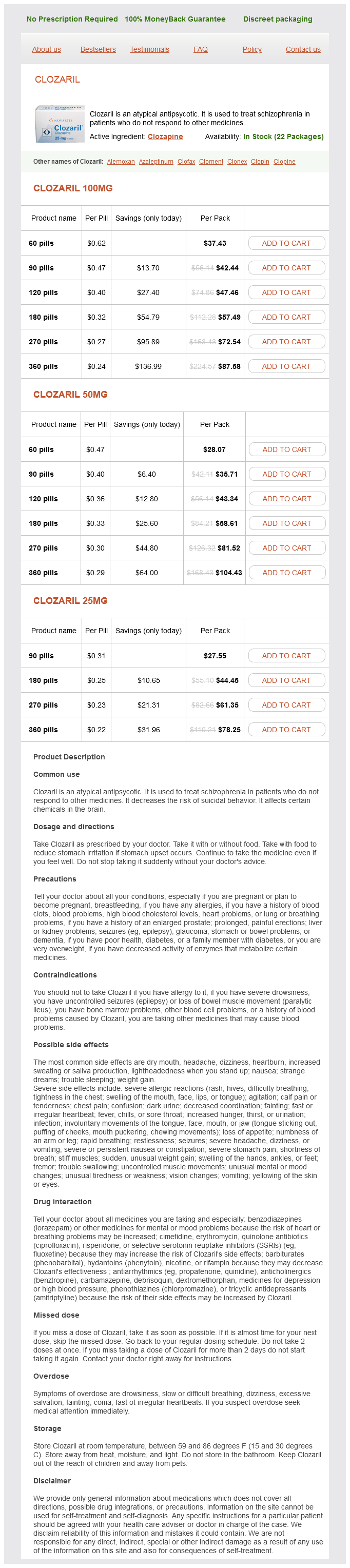 Has excellent ability to discriminate low-risk form high-risk patients in both men and women depression definition icd generic 50 mg clozapine visa. The categories are further divided into psychological, chemical health, reliability, and social support. Patients who score as a risk on these tools should not be excluded from using opioids, but they should be monitored and reassessed regularly and may need more frequent urine screening. Personal History of Substance Abuse Alcohol Illegal Drugs Prescription Drugs Age (mark box if 1645) 3. Predicting aberrant behaviors in opioid-treated patients: preliminary validation of the opioid risk tool. Score: Patient Selection for Chronic Opioid Analgesia Score Factor Diagnosis 1 = Benign chronic condition with minimal objective findings or not definite medical diagnosis. Intactability 1 = Few therapies have been tried and the patient takes a passive role in his/her pain management process. Risk (R = Total of P + C + R + S below) Physiological: 1 = Serious personality dysfunction or mental illness interfering with care. Chemical 1 = Active or very recent use of illicit drugs, excessive alcohol, or Health: prescription drug abuse. Reliability 1 = History of numerous problems: medication misuse, missed appointments, rarely follows through. Efficacy score 1 = Poor function or minimal pain relief despite moderate to high doses. Total score - D + I + R + E Score 713: Not a suitable candidate for long-term opioid analgesia Score 1421: Good candidate for long-term opioid analgesia Notes: a clinician-rated scale with questions in four categories: diagnosis, intractability, risk, and efficacy. A score of 14 and above indicates a patient is a good risk for opioid therapy and those with lower scores are not considered good risks for opioid therapy. How often have you had to go to someone other than your prescribing physician to get sufficient pain relief from your medications How often have you taken your medications differently from how they are prescribed How much of your time was spent thinking about opioid medications (having enough, taking them, dosing schedule, etc. How often have you had to make an emergency phone call or show up at the clinic without an appointment Notes: A 17-item self-report measure to identify aberrant drug-related behaviors for patients on chronic opioid therapy. The expectations and obligations for the patient and the clinician are clearly identified and reviewed. Criteria for continued use of these medications and identification of aberrant behaviors are reviewed. The treatment decision is based on a thorough assessment with documentation of treatment rationale and the current status of the agreement. If the patient is discharged from the practice, a discussion with the patient as to the circumstances that led to this decision must take place. Directions for opioid weaning, management of withdrawal side effects, and referral to an alternate provider, be that an addictions specialist or pain specialist, should be included in this discussion with accompanying documentation. If a patient has demonstrated some aberrant behaviors or deviated from the opioid agreement, more frequent urine screens than the usual 3-month screen may be indicated. Testing procedures can be variable, and a two-step urine screen is suggested: the first step is a general screen to classify compounds using enzyme immunoassay. A positive urine drug test result is defined as the prescribed drug not present; presence of an unprescribed opioid, or the presence of an illicit substance. Cross-reactivity and false positive and negatives can confound the results of the urine screen and skew results. If the patient deviates from the opioid agreement, the clinician must decide on an appropriate course of action. There are several options that are currently being used: Discharging the patient from the practice Continuing to treat the patient without opioid analgesics Continuing to treat the patient with greater vigilance Referring the patient to a pain specialist or addictionologist Prescribing Opioid Medication Safely Elements of the opioid agreement vary in content, but generally they include the following: 1. Expected patient behaviors Prescribing Opioid Medication Safely Codeine and heroin metabolize to morphine, so both substances may be identified in urine following codeine or heroin use, resulting in a false positive for morphine. Marijuana can be detected in urine after cessation of use for up to 80 days in heavy users. Cocaine may be present in urine for 23 days if used as a topical anesthetic in dental or other procedures, and medical records should confirm this. Heroin is difficult detect due to a half-life of 530 minutes, resulting in false negatives. A small percentage of patients metabolize opioid, especially oxycodone, rapidly resulting in a false negative for this drug. The elements of this two-page follow-up assessment tool include the following: Current analgesic regime Level of analgesia; average, worst, amount of pain relief from medications Activities of daily living; physical, family and social relationships, mood, and sleep Adverse events Understanding Aberrant Behaviors Some patients who are taking opioids regularly to manage chronic pain can develop aberrant behaviors that may or may not indicate addiction. These behaviors may have a different source such as unrelieved pain related to undertreatment, or financial concerns. Behaviors that are more predictive of addiction include concurrent use of illicit drugs, stealing or selling prescription drugs, injecting oral medications, repeated resistance to changes in therapy although there are clear negative effects, and deterioration in family and work relationships related to drug use. Validation of a screener and opioid assessment measure for patients with chronic pain. The impact of pain on quality of life and the unmet needs of pain management: results from pain sufferers and physicians participatin
