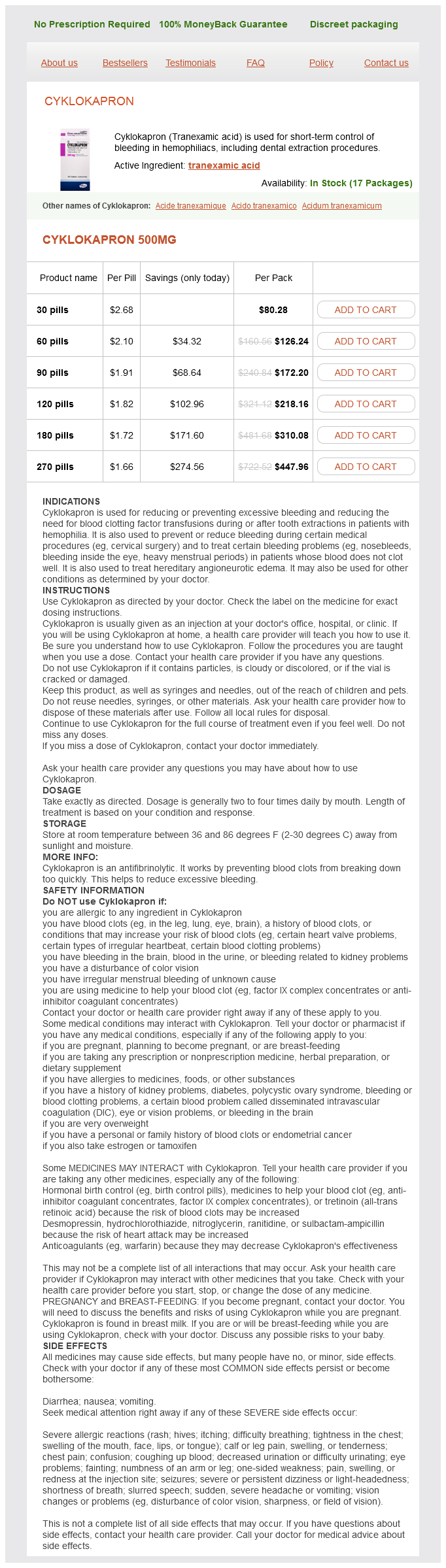 Cyklokapron works by preventing the breakdown of blood clots, which helps to manage bleeding. It does this by blocking the exercise of a protein that causes blood clots to dissolve. This medication is available in pill type and could be taken orally. It can be administered intravenously in hospital settings for extra severe bleeding circumstances.