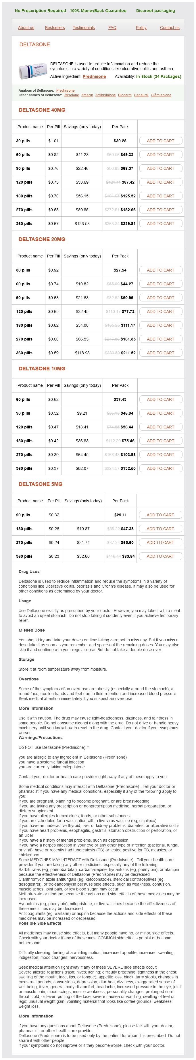 Deltasone is a medicine that falls underneath the class of corticosteroids, that are hormones produced by the adrenal glands. It is usually prescribed to reduce inflammation and alleviate signs in numerous circumstances corresponding to ulcerative colitis and bronchial asthma.