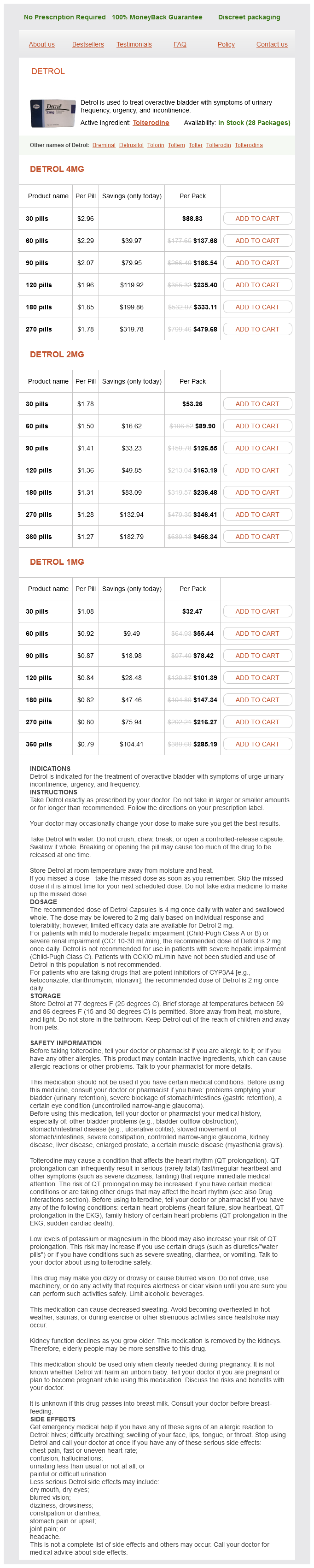 The medication is out there in two forms - Detrol tablets and Detrol LA extended-release capsules. Both forms are taken orally with or with out food, as directed by a doctor. The traditional really helpful dose is 4mg as quickly as a day for both varieties. However, in some cases, a decrease dose could also be prescribed, particularly for sufferers with liver or kidney problems. It is necessary to follow the dosage directions given by your doctor to ensure the maximum advantages from the treatment.
