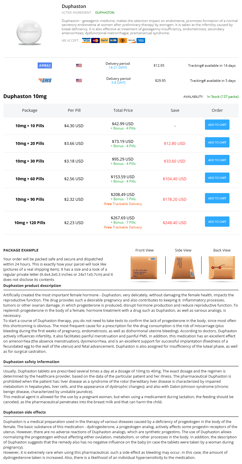 Quantitative assessment of sensing and sequestration of spherocytic erythrocytes by the human spleen menstruation yeast infection purchase 10mg duphaston with amex. Macrophage plasticity and interaction with lymphocyte subsets: cancer as a paradigm. An unrestrained proinflammatory M1 macrophage population induced by iron impairs wound healing in humans and mice. Direct comparison of Sn-mesoporphyrin, an inhibitor of bilirubin production, and phototherapy in controlling hyperbilirubinemia in term and near-term newborns. Limited role for the bilirubin-biliverdin redox amplification cycle in the cellular antioxidant protection by biliverdin reductase. Dysfunction of the heme recycling system in heme oxygenase 1 deficient mice: effects on macrophage viability and tissue iron distribution. Membrane lipid composition and vesicle size modulate bilirubin intermembrane transfer. Regulation by heme of mitochondrial protein transport through a conserved amino acid motif. Characterization of recombinant human erythropoietin produced in Chinese hamster ovary cells. A common model for cytokine receptor activation: combined scissor-like rotation and self-rotation of receptor dimer induced by class I cytokine. Jak2 deficiency defines an essential developmental checkpoint in definitive hematopoiesis. The distal region and receptor tyrosines of the Epo receptor are non-essential for in vivo erythropoiesis. Involvement of phosphatases in proliferation, maturation, and hemoglobinization of developing erythroid cells. Mutation in murine erythropoietin receptor induces erythropoietin-independent erythroid proliferation in vitro, polycythemia in vivo. Apoptosis protection by the Epo target Bcl-X(L) allows factor-independent differentiation of primary erythroblasts. Effects of recombinant erythropoietin on murine megakaryocytic colony formation in vitro. Simultaneous measurement of reticulocyte and red blood cell indices in healthy subjects and patients with microcytic and macrocytic anemia. Identification of a functional role for lipid asymmetry in biological membranes: phosphatidylserine-skeletal protein interactions modulate membrane stability. Analysis of integral membrane protein contributions to the deformability and stability of the human erythrocyte membrane. Skubitz Specific (Secondary) Granules Although some specific (also called secondary) granules, like azurophilic granules, fuse with phagocytic vesicles, it is believed that these granules are largely for release into the extracellular space. For example, collagenase may degrade collagen, thus augmenting movement through collagen and participating in tissue remodeling. Apolactoferrin, by binding iron, may have an antibacterial effect by preventing bacteria from obtaining necessary iron for growth. When cells are stimulated, the surface expression of many of these membrane proteins is increased, and some of the upregulated molecules may be derived from specific granules. The importance of the specific granules in neutrophil function is shown in patients who lack specific granules; these patients are susceptible to repeated skin and respiratory infections and have defective neutrophil chemotaxis and adhesion. Many studies have been performed to identify and characterize the molecular composition of the various subcellular compartments of neutrophils. Two techniques are commonly used for this purpose: immunoelectron microscopy and subcellular fractionation. Most recent subcellular fractionation studies used the technique of nitrogen cavitation to disrupt the neutrophils. In this technique, cells are equilibrated with nitrogen at high pressure and then released into a pressure of 1 atm. The rapid decrease in extracellular pressure results in disruption of the cells by the formation of nitrogen gas within the cell. Although the granules of neutrophils may be best viewed as a continuous spectrum of granules, possibly resulting from differential production of different granule contents during neutrophil development, studies of neutrophils have operationally defined several types of granules. Four well-defined types of granules in neutrophils are primary granules, secondary granules, tertiary granules, and secretory vesicles, although additional heterogeneity of these fractions may exist. These granules fuse with phagocytic vesicles, resulting in the delivery of their contents to the ingested organism. Neutrophils are so named because of their neutral staining with Wright stain, whereas eosinophils avidly stain with the dye eosin, and basophils have readily identified large darkstaining granules with Wright stain. Neutrophils play a critical role in host defense by phagocytizing and digesting microorganisms, and inappropriate activation of neutrophils may result in damage to normal host tissues. In the resting uninfected host, the production and elimination of neutrophils are balanced, resulting in a fairly constant concentration of neutrophils in peripheral blood. When an infection occurs, chemotactic agents are generated that result in migration of neutrophils to the site of the infection and activation of neutrophil defensive functions. This effect is often associated with an increased production and release of neutrophils from the bone marrow. This chapter reviews the structure, morphology, production, distribution and kinetics, and functions of neutrophils.