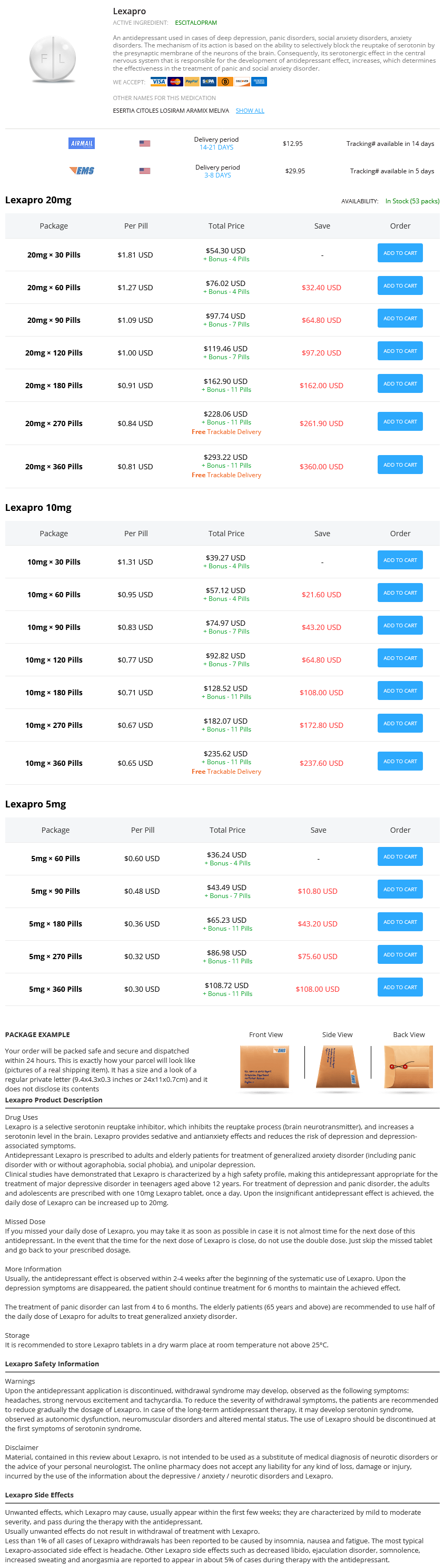 Escitalopram, also identified by its model name Lexapro, is an antidepressant medication that is commonly prescribed for people who suffer from deep melancholy, panic problems, social anxiety issues, and other nervousness problems. Its mechanism of action is predicated on its ability to selectively block the reuptake of serotonin by the presynaptic membrane of the neurons in the mind. This in the end increases the serotonergic effect within the central nervous system, which is answerable for the development of the antidepressant impact and makes it highly efficient in treating panic and social anxiousness dysfunction.