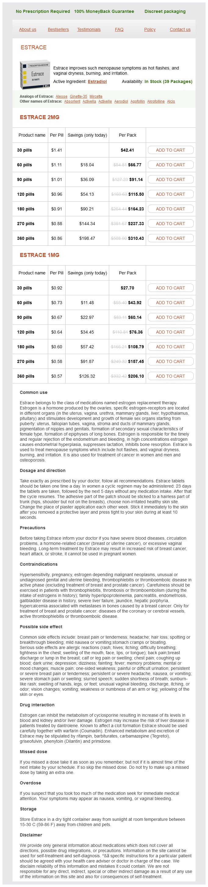 Estrace also helps to prevent a situation often recognized as vaginal atrophy, which is the thinning, drying, and irritation of the vaginal walls as a result of decrease in estrogen ranges. This situation may cause discomfort and ache with intercourse and increase the danger of urinary tract infections. By utilizing Estrace, women can preserve the well being of their vaginal tissues and forestall these problems.