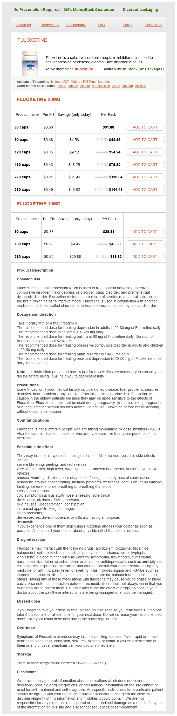 Longitudinal associations among posttraumatic stress disorder symptoms women's health center reno order fluoxetine 20 mg without prescription, traumatic brain injury, and neurocognitive functioning in army soldiers deployed to the Iraq war. Traumatic brain injury and posttraumatic stress disorder: Conceptual, diagnostic, and therapeutic considerations in the context of cooccurrence. Reduced hippocampal volume and total white matter volume in posttraumatic stress disorder. Biased emotional attention in posttraumatic stress disorder: A help as well as a hindrance Multisite investigation of traumatic brain injuries, posttraumatic stress disorder, and self reported health and cognitive impairments. Among the lifestyle characteristics examined, physical activity and dietary practices have been most extensively studied (Scarmeas et al. In addition, several lines of evidence among humans suggest that more limited intake of energy may confer reduced risk of dementia. Similarly, several randomized trials have provided evidence, albeit preliminary, that intentional caloric restriction may improve cognitive performance (Witte, Fobker, Gellner, Knecht, & Floel, 2009) and improve neuroimaging markers of brain health (Espeland et al. Nevertheless, multiple studies have suggested that lower weight, particularly underweight, is associated with worse outcomes among older adults, in contrast to the protective effects demonstrated in midlife. Smith Epidemiological Data Accumulating evidence suggests that lower levels of caloric intake may be associated with improved cognitive performance and reduced rates of dementia. Although several recent examinations have been conducted in humans, this relationship has been studied extensively among animals. Despite relatively limited evidence in humans linking caloric restriction directly to brain outcomes, multiple, indirect lines of evidence support the notion that restricted energy intake may have salubrious effects. For example, multiple studies have demonstrated that being overweight or obese, particularly in midlife, is a risk factor for dementia (Kivipelto et al. Although the mechanisms linking obesity to dementia are likely multifactorial (Craft, 2009), recent studies have suggested that the presence of obesity in midlife is associated with neuropathological correlates of dementia, including neurofibrillary tangles (Chuang et al. Despite these findings, it must also be noted that not all studies have shown an association between obesity and increased risk of dementia, a phenomenon that has come to be referred to as the "obesity paradox" (Driscoll et al. Independent of studies examining obesity, a separate line of evidence suggests that more modest caloric intake is associated with improved longevity and that excess energy intake is associated with adverse cognitive outcomes. A wellknown association has also been documented between chronic, markedly diminished caloric intake and improved longevity among Okinawans, who have a high prevalence of centenarians and relatively low rates of dementia (Willcox et al. In an archival analysis of centenarian Okinawans, participants even reported a 10. Randomized Trials Relatively few randomized trials have directly tested the impact of caloric restriction in human participants. Following 3 months of treatment, individuals in the caloric restriction group exhibited increased verbal memory scores, and these improvements were correlated with decreased levels of fasting insulin and Creactive protein. Participants were randomly assigned to one of four groups: caloric restriction, caloric restriction and exercise, a lowcalorie diet condition, or to a control group (weight maintenance). At baseline, 3 months, and again at 6 months, cognitive tests were administered assessing verbal and visual memory, as well as concentration/attention. Overall, cognitive function changed very little across any group, and no consistent pattern of change emerged. In addition, changes in cognitive performance were not related to changes in caloric intake (indexed by daily energy deficit) or weight loss. Several other randomized trials provide preliminary evidence that caloric restriction may confer cognitive and/or brain benefits in various patient populations. We previously examined this relationship in a sample of 120 middleaged adults with hypertension and overweight or obesity (Smith et al. In one of the longest randomized trials to examined caloric restriction, Espeland et al. In order to examine this relationship, the authors conducted a per protocol analysis, incorporating only individuals who exhibited at least modest weight loss. At the time of the 10year followup, participants in the intervention group exhibited 28% lower white matter volume compared with control participants, who underwent a diabetes support and education program. In contrast, improvements in cognitive performance were relatively modest, only being observed on one subtest of processing speed. In a per protocol analysis, the authors excluded individuals in the intervention group who did not lose at least 10% body weight, as well as participants in the control group who lost more than 5% of body weight. Participants in the intervention group exhibited improved memory performance paralleled by increased gray matter volume in the inferior frontal gyrus and hippocampus, as well as augmented hippocampal restingstate functional connectivity to parietal areas. The effects appeared to be specific to transient negative energy balance and were not detected after subsequent weight maintenance. An overlapping but conceptually distinct question is whether weight loss is associated with improvements in neurocognitive performance. Although many studies achieve weight loss through a combination of exercise and dietary modification, more modest weight loss may be achieved through exercise alone. In addition, some studies have examined the impact of weight loss through bariatric surgery and