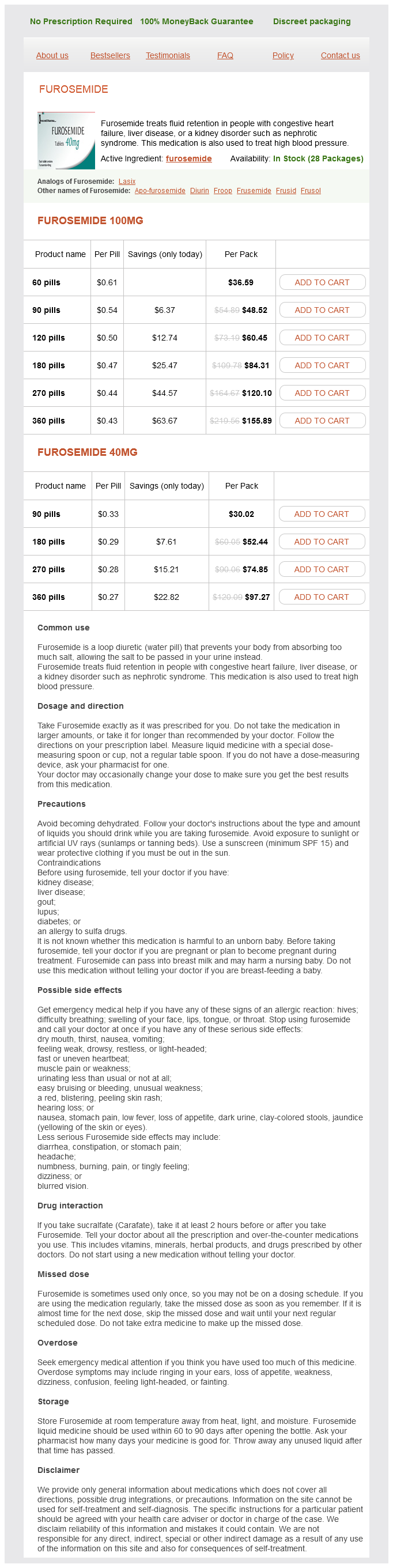 In pregnancy heart attack pulse order furosemide 100 mg without prescription, penicillin is the only effective therapy to prevent congenital syphilis. Therefore, the best treatment for this woman with probable syphilis is intramuscular penicillin (after confirming the diagnosis). In the previous scenario, the woman with a nontender vulvar ulcer is likely to have syphilis. The student should strive to know the limitations of various diagnostic tests, and the manifestations of disease. Approach to Surgery the student should be generally aware of the various approaches to surgical management of the gynecologic patient. Ways to access the intraabdominal cavity include (a) laparotomy (incision of the abdomen), (b) laparoscopy (using thin, long instruments through small incisions to perform surgery), and (c) robotic surgery (use of the console to direct instruments that have been docked). Some of the relative advantages and disadvantages of laparoscopy versus robotics include: Robotics: Better 3D visualization and magnification, better ability to manipulate instruments such as rotating "EndoWrist" stitching, less "fulcrum effect" of long instruments, better ergonomics for surgeon, restoration of eye-target perspective. Laparoscopy: Better "feel" of tissue and force used, less expensive, smaller "footprint" of machine, possibly less operative time. H ysteroscopy is a means to examine or perform surgery on the intrauterine cavity by inserting a distension media in the uterus and using a small, thin scope going through the cervix to visualize the endometrial cavity. There are four steps to the clinical approach to the patient: making the diagnosis, assessing severity, treating based on severity, and following response. There are seven questions that help to bridge the gap between the textbook and the clinical arena. On pelvic examination, she has been noted to have a change in cervical examinations from 4-cm dilation to 5-cm over the last 2 hours. H er cervix has changed from 4- to 5-cm dilation over 2 hours with uterine contractions noted every 2 to 3 minutes. Know the normal labor parameters in the latent and active phase for nulliparous and multiparous patients. Be familiar with the management of common labor abnormalities and know that normal labor does not require intervention. Know that rubella vaccination, as a live-attenuated preparation, should not be administered during pregnancy. She has not yet reached active phase of labor (generally about 6 cm of dilation) and her cervix has changed from 4 to 5 cm over 2 hours; her contractions are every 2 to 3 minutes. Previously, active phase was defined as beyond 4 cm of cervical dilation; however, recent studies have shown that active phase cannot be reliably defined until 6 cm of dilation. In the latent phase of labor, there is no need for intervention; however, if the progress is prolonged or uterine contractions are inadequate, oxytocin is an option. Because she has had normal labor, the appropriate management is to observe her course without intervention. The clinical pelvimetry is accomplished by digital palpation of the pelvic bones (passageway). Unfortunately, s this estimation is not very precise, and in clinical practice, the clinician would generally observe the labor of a nulliparous patient. Finally, the nonimmune rubella status should alert the practitioner to immunize for rubella during the postpartum time (since the rubella vaccine is live attenuated and is contraindicated during pregnancy). Fetal bradycardia is a baseline < 110 bpm, and fetal tachycardia is exceeding 160 bpm. There are three types of decelerations: early (mirror image of uterine contractions), variable (abrupt jagged dips below the baseline), and late, which are offset following the uterine contraction. When a labor abnormality is diagnosed, the three Ps should be evaluated (powers, passenger, and pelvis). When the latent phase exceeds the upper limits of normal, then it is called a prolonged latent phase. When the cervix has exceeded 6 cm, particularly with near-complete effacement, then the active phase has been reached. Recent studies have shown that as long as there is continued progress of labor in the active phase, in the absence of complications, the labor should be observed. When there is cephalopelvic disproportion, where the pelvis is thought to be too small for the fetus (either due to an abnormal pelvis or an excessively large baby), then cesarean delivery must be considered. Many clinicians choose to use internal uterine catheters to evaluate the adequacy of the powers, a practice that may reduce cesareans. Fetal Heart Rate Monitoring Fetal heart rate assessment can help to assess the fetal status. A normal baseline between 110 and 160 bpm, with accelerations, and variability are indicative of a normal well-oxygenated fetus. If these are intermittent with abrupt return to baseline, then they can be observed. Late decelerations are "offset" from the uterine contraction with their onset after the onset of the contraction, the nadir following the contraction peak, and the return to baseline following the contraction resolution. Late decelerations suggest fetal hypoxia, and if recurrent (> 50% of uterine contractions), can indicate fetal acidemia. Category I is reassuring-normal baseline and variability, no late or variable decelerations. The reasons in order of frequency are labor dystocia (34% abnor), mal fetal heart rate pattern (23% fetal malpresentation (17%), multiple gestation), (7%), and suspected fetal macrosomia (4%). As compared to vaginal delivery, cesarean has a higher overall severe morbidity or mortality rate, and a 3. Scalp stimulation inducing an acceleration highly correlates to a normal umbilical cord pH (7.