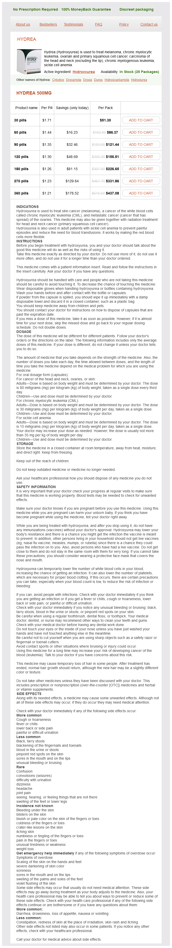 Hydrea, also referred to as Hydroxyurea, is a medicine that's primarily used to treat a variety of cancers, together with melanoma, persistent myelocytic leukemia, ovarian and first squamous cell most cancers, and carcinoma of the head and neck (excluding the lip). It can be used to treat persistent myelogenous leukemia and sickle cell anemia. Hydrea works by slowing down or stopping the expansion and spread of most cancers cells in the body.