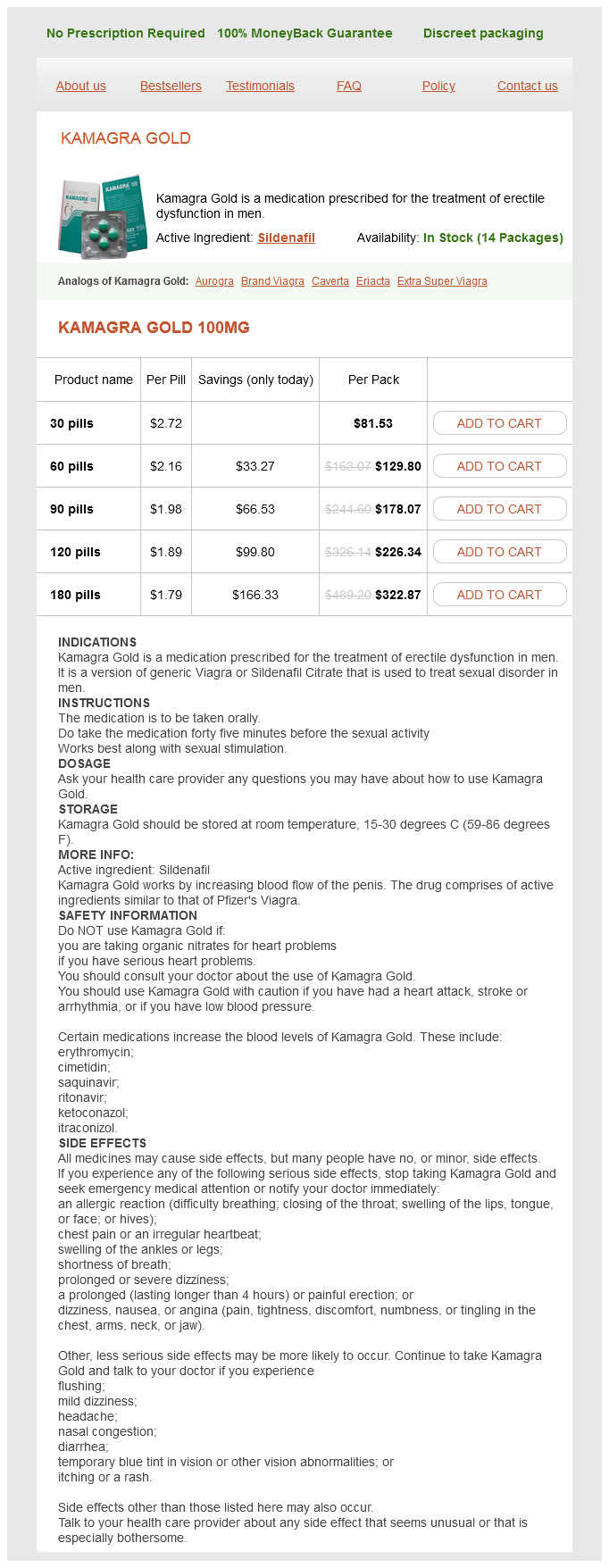 Sympathomimetic agents could thus benefit the acutely failing heart: b1-stimulation by an inotropic effect erectile dysfunction age factor 100 mg kamagra gold order free shipping, b2-stimulation by afterload reduction (peripheral arterial vasodilation), and a-stimulation by restoring pressure in hypotensive states (see Table 6-2). Although b2-activation achieves beneficial vasodilation and also mediates some inotropic effect, such stimulation also causes hypokalemia with enhanced risk of arrhythmias. A further and serious problem is that prolonged or vigorous b1-stimulation may lead to or increase receptor downgrading with a diminished inotropic response. These are the reasons why sympathomimetics are used only in short-term treatment of acute heart failure. In severe acutely decompensated chronic heart failure patients, those admitted on b-blockers, and also at discharge, had a decreased 180-day mortality. Although the latter aim can be achieved by pure a-stimulants, such as phenylephrine (5 to 20 mg in 500 mL slow infusion) or methoxamine (5 to 10 mg at 1 mg/min), this option is not logical, because heart failure automatically invokes reflex adrenergic vasoconstriction. Combined inotropic and vasoconstrictor effects are occasionally required, as may be achieved by high-dose dopamine. If inotropic stimulation plus peripheral vasodilation is required, then dobutamine and a vasodilator, low-dose dopamine, or milrinone is appropriate. Dobutamine Dobutamine, a synthetic analog of dopamine, is a competitive b-adrenergic stimulating agent (b1. However, its b2 stimulatory effect may lead to hypotension and sometimes to a fall in diastolic pressure with reflex tachycardia. Furthermore, long-term mortality may be increased,19 as well as increasing cardiac sympathetic activity in heart failure patients Pharmacokinetics, dose, and indications. A precaution is to dilute in sterile water or dextrose or saline, not in alkaline solutions. Dopamine Dopamine is a catecholamine-like agent used for therapy of severe heart failure and cardiogenic shock. Physiologically, it is both the precursor of norepinephrine and releases norepinephrine from the stores in the nerve-endings in the heart. However, in the periphery this effect is overridden by the activity of the prejunctional dopaminergic-2 receptors, inhibiting norepinephrine release and thereby helping to vasodilate. Therefore overall dopamine stimulates the heart by both b- and a-adrenergic responses and causes vasodilation through dopamine receptors. Dopamine, a "flexible molecule," also fits in to many receptors to cause direct b1- and b2-receptor stimulation, as well as a-stimulation. The latter explains why in high doses dopamine causes significant vasoconstriction. Dopamine can only be given intravenously, which restricts its use to short-term treatment. Worsening renal function and hypokalemia related to diuretic use for acute decompensated heart failure are common and associated with poor prognosis. In acute heart failure patients, the combination of low-dose furosemide (5 mg/h) and low-dose dopamine (5 mcg/kg/min) as a continuous infusion for 8 hours was equally 6 - Heart Failure 179 effective as high-dose furosemide but associated with improved renal function profile and potassium homeostasis. Dopamine is sometimes given for renal protection or for diuresis in critically ill patients at a typical dose of 0. This dose did not work in an intensive care setting, arguing against the renoprotective concept. In critically ill hypoxic patients, dopamine may have undesirable side effects such as depression of ventilation and increased pulmonary shunting, which may require supplemental oxygen. Extravasation can cause sloughing, prevented by infusing the drug in to a large vein through a plastic catheter, and treated by local infiltration with phentolamine. Dopamine is the preferred inotrope in the patient who requires both a pressor effect (high-dose a-effect) and increase in cardiac output, and who does not have marked tachycardia or ventricular irritability. In cardiogenic shock, infusion of equal concentrations of dopamine and dobutamine may afford more advantages than either drug singly. The key to the effective use of these (and all intravenous inotropes) is careful monitoring of the clinical and hemodynamic response in the individual patient. Epinephrine (Adrenaline) Epinephrine gives mixed b1- and b2-stimulation with some added a-mediated effects at a high dose (see Table 6-2). It is used chiefly when combined inotropic-chronotropic stimulation is urgently needed, as in cardiac arrest. Side effects include tachycardia, arrhythmias, anxiety, headaches, cold extremities, cerebral hemorrhage and pulmonary edema. Contraindications include late pregnancy because of risk of inducing uterine contractions. Norepinephrine (Noradrenaline) Norepinephrine is given in an intravenous dose of 8 to 12 mcg/min with a terminal half-life of 3 minutes. Norepinephrine chiefly stimulates a-receptors in the periphery (with more marked a-effects than epinephrine) and b-receptors in the heart. Logically, norepinephrine should be of most use when a shocklike state is accompanied by peripheral vasodilation ("warm shock"). Side effects of norepinephrine include headache, tachycardia, bradycardia, and hypertension. As with all of the catecholamines and vasodilators, note the risk of necrosis with extravasation. Contraindications include late pregnancy (see "Epinephrine" earlier in chapter) and preexisting excess vasoconstriction. Its cardiovascular effects closely resemble those of exercise, including a positive inotropic and vasodilatory effect.
