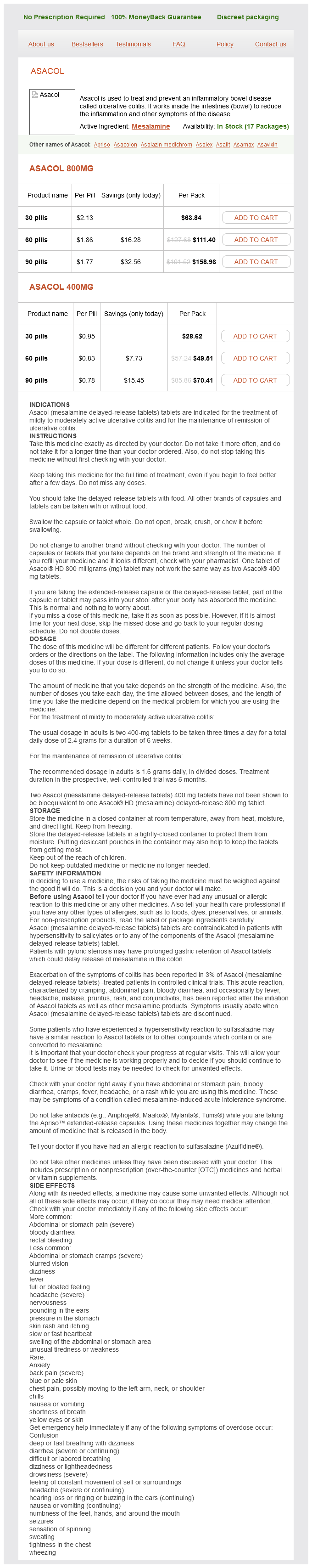 Apart from treating energetic symptoms, Asacol can be used as upkeep remedy to stop flare-ups and preserve remission in sufferers with ulcerative colitis. Studies have shown that long-term use of mesalamine reduces the variety of relapses and helps patients preserve their quality of life. It can also be believed that early use of mesalamine can forestall the development of ulcerative colitis, reducing the dangers of severe complications.