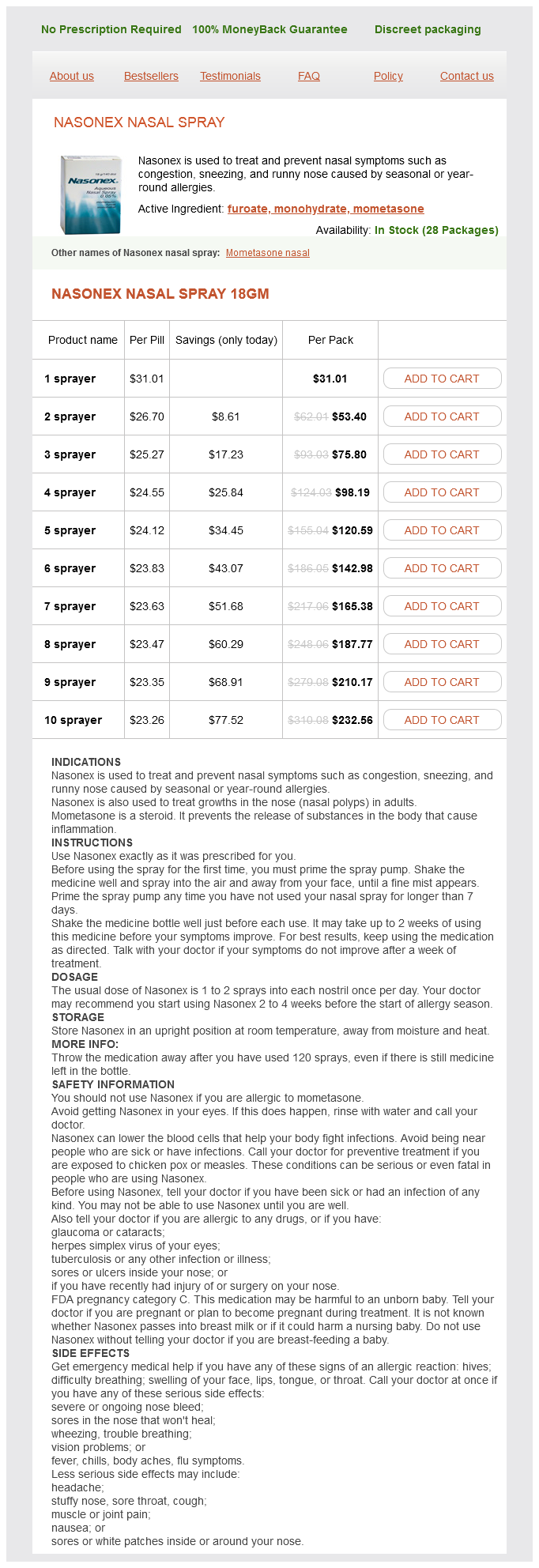 With such typical features allergy treatment center st louis order genuine nasonex nasal spray on-line, a confident clinical diagnosis can be made in adults aged >40 yr. Clinical hallmarks: Heberden and Bouchard nodes and/or bony enlargement with or without deformity. Function should be carefully assessed and monitored using validated outcome measures. A posteroanterior radiograph of both hands on a single film or field of view is adequate for diagnosis. It is a common complex joint disorder showing focal cartilage loss, new bone formation, and involvement of all joint tissues. However, the ability to discriminate subsets and the relevance for routine practice are unclear. Additional features that may be present include deformity (fixed flexion and/or varus-less commonly valgus), instability, periarticular or joint-line tenderness, and pain on patellofemoral compression. Other important considerations are referred pain, ligamentous and meniscal lesions, and bursitis. Classical features are focal joint space narrowing, osteophyte, subchondral bone sclerosis, and subchondral cysts. If a palpable effusion is present, synovial fluid should be aspirated and analyzed to exclude inflammatory disease and to identify urate and calcium pyrophosphate crystals. Plain radiography and magnetic resonance imaging diagnostics in osteoarthritis: validated staging and scoring. Prevalence, incidence, and progression of hand osteoarthritis in the general population: the Framingham Osteoarthritis Study. Because many factors such as country of residence, health care system factors, demographic factors, comorbidities, willingness to undergo surgery, and psychological factors influence the receipt of a joint replacement, perhaps a more appropriate metric in this regard would be progression leading to the need for total joint replacement; how this would be defined for research and policy purposes is currently the subject of considerable attention in the epidemiologic research community. However, recent studies using novel methods to control for confounding have suggested a closer relationship between radiographic findings and symptoms. In the Study of Osteoporotic Fractures, of approximately 6000 women followed over 8 years, 12. Although a variety of confounding factors contribute to whether or not an individual gets a joint replacement. The effect of osteoarthritis definition on prevalence and incidence estimates: a systematic review. The American College of Rheumatology criteria for the classification and reporting of osteoarthritis of the hip. Impact of different descriptions of the Kellgren and Lawrence classification criteria on the diagnosis of knee osteoarthritis. The natural history of radiographic knee osteoarthritis: A fourteen-year population-based cohort study. Defining incident radiographic hip osteoarthritis for epidemiologic studies in women. Prevalence of radiographic and symptomatic hip osteoarthritis in an urban United States community: the Framingham osteoarthritis study. Extreme variations in racial rates of total hip arthroplasty for primary coxarthrosis: a population-based study in San Francisco. Very low prevalence of hip osteoarthritis among Chinese elderly in Beijing, China, compared with whites in the United States: the Beijing osteoarthritis study. Prevalence and Risk Factors of Spine, Shoulder, Hand, Hip, and Knee Osteoarthritis in Community-dwelling Koreans Older Than Age 65 Years. Prevalence of knee, osteoarthritis in the United States: arthritis data from the Third National Health and Nutrition Examination Survey 1991-94. Increasing prevalence of knee pain and symptomatic knee osteoarthritis: survey and cohort data. Prevalence of knee symptoms and radiographic and symptomatic knee osteoarthritis in African Americans and Caucasians: the Johnston County Osteoarthritis Project. Prevalence of knee osteoarthritis, risk factors, and quality of life: the Fifth Korean National Health And Nutrition Examination Survey. Comparison of the prevalence of knee osteoarthritis between the elderly Chinese population in Beijing and whites in the United States: the Beijing Osteoarthritis Study. Case definitions of knee osteoarthritis in 4,151 unselected subjects: relevance for epidemiological studies: the Copenhagen Osteoarthritis Study. Joint space, width of the tibiofemoral and of the patellofemoral joint in chronic knee pain with or without radiographic osteoarthritis: a 2-year follow-up. Prevalence and pattern of radiographic hand osteoarthritis and association with pain and disability (the Rotterdam study). Prevalence, incidence and progression of hand osteoarthritis in the general population: the Framingham Osteoarthritis Study. Radiographically defined osteoarthritis of the hand and knee in young and middle-aged African American and Caucasian women. Differences in multijoint radiographic osteoarthritis phenotypes among African Americans and Caucasians: the Johnston County Osteoarthritis project. Lower prevalence of hand osteoarthritis among Chinese subjects in Beijing compared with white subjects in the United States: the Beijing Osteoarthritis Study. Comparison of the prevalence of radiographic osteoarthritis of the knee and hand between Japan and the United States. Lumbar spine radiographic features and demographic, clinical, and radiographic knee, hip, and hand osteoarthritis. Radiographic evaluation of foot osteoarthritis: sensitivity of radiographic variables and relationship to symptoms. Methodologic challenges in studying risk factors for progression of knee osteoarthritis. Association of incident, symptomatic hip osteoarthritis with differences in hip shape by active shape modeling: the Johnston County Osteoarthritis Project.