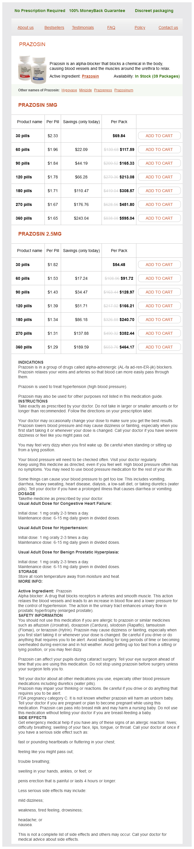 Prazosin is available in the type of tablets and is usually prescribed to be taken a few times a day, relying on the situation being treated. It is important to take it at the identical time each day to maintain a consistent degree of the drug within the body. The dosage may differ relying on the patient's age, medical historical past, and response to therapy, and should be determined by a health care provider.