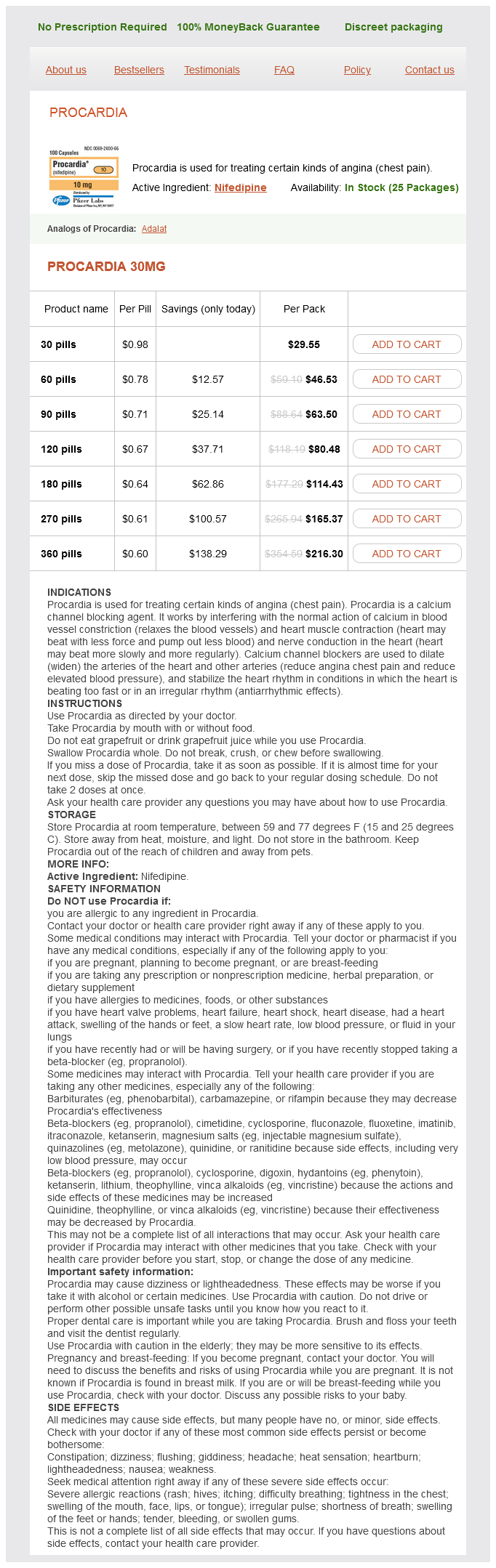In conclusion, Procardia is a generally prescribed medicine for the therapy of angina. It has been confirmed to effectively scale back the frequency and severity of angina attacks and enhance train tolerance. However, as with every medicine, there could additionally be potential side effects and precautions that have to be taken. It is necessary to consult a well being care provider before beginning Procardia and to intently observe dosage directions. Procardia, when used appropriately, can be a extremely effective treatment for angina, offering relief and enhancing the quality of life for individuals who suffer from this condition.