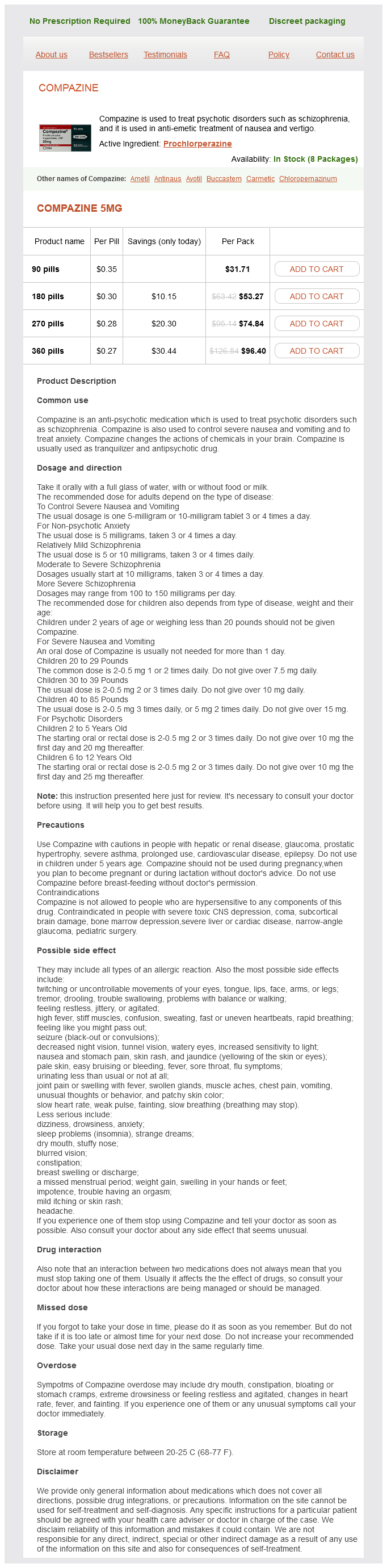 In conclusion, prochlorperazine, also identified as Compazine, is a strong and versatile medication that's extremely effective in treating both psychological well being disorders and bodily signs corresponding to nausea and vertigo. With its lengthy historical past of successful use and minimal side effects, it continues to be a most well-liked remedy possibility for sufferers and healthcare professionals alike. If you may be experiencing symptoms of schizophrenia, bipolar dysfunction, or nausea and vertigo, speak to your physician about whether prochlorperazine could additionally be an appropriate treatment for you.