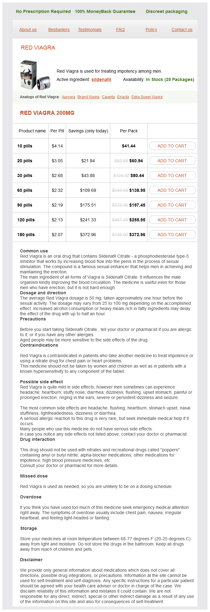 Red Viagra is a well-known medication used for treating impotency among men. It is a powerful and effective drug that has been helping men all round the world regain their sexual confidence. With its stunning red color and unparalleled results, Red Viagra has turn out to be a popular alternative for men struggling with erectile dysfunction.