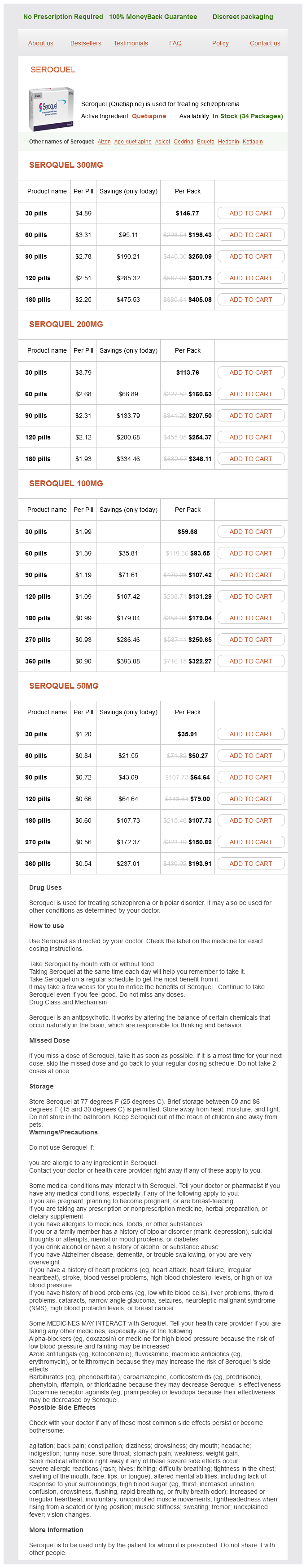 Yamazaki K 2003 Unique follicular carcinoma of the thyroid gland with extracellular deposition of amorphous globular structures mimicking an adenoid cystic pattern medications bad for kidneys discount seroquel 300 mg online. Rosen I B, Luk S, Katz I 1985 Hürthle cell tumor behavior: dilemma and resolution. Caplan R H, Abellera R M, Kisken W A 1984 Hürthle cell tumors of the thyroid gland. Bishop J A, Wu G, Tufano R P, Westra W H 2012 Histological patterns of locoregional recurrence in Hürthle cell carcinoma of the thyroid gland. Mills S C, Haq M, Smellie W J, Harmer C 2009 Hürthle cell carcinoma of the thyroid: retrospective review of 62 patients treated at the Royal Marsden Hospital between 1946 and 2003. Haigh P I, Urbach D R 2005 the treatment and prognosis of Hürthle cell follicular thyroid carcinoma compared with its non Hürthle cell counterpart. Davila R M, Bedrossian C W, Silverberg A B 1988 Immunocytochemistry of the thyroid in surgical and cytologic specimens. Johnson T L, Lloyd R V, Thor A 1987 Expression of ras oncogene p21 antigen in normal and proliferative thyroid tissues. Kapp D S, LiVolsi V A, Sanders M M 1982 Anaplastic carcinoma following well-differentiated thyroid cancer: etiological considerations. Nishiyama R H, Dunn E L, Thompson N W 1972 Anaplastic spindle-cell and giant-cell tumors of the thyroid gland. Miettinen M, Franssila K O 2000 Variable expression of keratins and nearly uniform lack of thyroid transcription factor 1 in thyroid anaplastic carcinoma. Are C, Shaha A R 2006 Anaplastic thyroid carcinoma: biology, pathogenesis, prognostic factors, and treatment approaches. Perri F, Lorenzo G D, Scarpati G D, Buonerba C 2011 Anaplastic thyroid carcinoma: A comprehensive review of current and future therapeutic options. Haynik D M, Prayson R A 2005 Immunohistochemical expression of cyclooxygenase 2 in follicular carcinomas of the thyroid. Asa S L 2005 the role of immunohistochemical markers in the diagnosis of follicular-patterned lesions of the thyroid. Schmidt R J, Wang C A 1986 Encapsulated follicular carcinoma of the thyroid: diagnosis, treatment and results. Rosai J, Saxen E A, Woolner L 1985 Undifferentiated and poorly differentiated carcinoma. Semin Diagn Pathol 2: 123126 18 Tumors of the Thyroid and Parathyroid Glands of squamous cell carcinoma of the thyroid. Histopathology 11: 715-722 Carcangiu M L, Zampi G, Rosai J 1984 Poorly differentiated ("insular") thyroid carcinoma. Virchows Arch A Pathol Anat Histopathol 417: 267-271 Wolf B C, Sheahan K, DeCoste D et al. Int J Surg Pathol 19: 620-626 Cibull M L, Gray G F 1978 Ultrastructure of osteoclastoma-like giant cell tumor of thyroid. Am J Surg Pathol 2: 401-405 Silverberg S G, DeGiorgi L S 1973 Osteoclastoma-like giant cell tumor of the thyroid. Report of a case with prolonged survival following partial excision and radiotherapy. Arch Pathol Lab Med 129: e55-e57 Chetty R, Govender D 1999 Follicular thyroid carcinoma with rhabdoid phenotype. Virchows Arch 435: 133-136 Dominguez-Malagon H, Flores-Flores G, Vilchis J J 2001 Lymphoepithelioma-like anaplastic thyroid carcinoma: report of a case not related to Epstein-Barr virus. Ann Diagn Pathol 5: 21-24 Wan S K, Chan J K, Tang S K 1996 Paucicellular variant of anaplastic thyroid carcinoma. Semin Diagn Pathol 12: 45-63 Canos J C, Serrano A, Matias-Guiu X 2001 Paucicellular variant of anaplastic thyroid carcinoma: report of two cases. J Surg Oncol 42: 136-143 Huang T Y, Assor D 1971 Primary squamous cell carcinoma of the thyroid gland: a report of four cases. Am J Clin Pathol 55: 93-98 Huang T Y, Lin S G 1986 Primary squamous cell carcinoma of the thyroid. J Surg Oncol 39: 175-178 Simpson W J, Carruthers J 1988 Squamous cell carcinoma of the thyroid gland. Am J Surg 156: 44-46 Shimaoka K, Tsukada Y 1980 Squamous cell carcinomas and adenosquamous carcinomas originating from the thyroid gland. Lam K Y, Lo C Y, Liu M C 2001 Primary squamous cell carcinoma of the thyroid gland: an entity with aggressive clinical behaviour and distinctive cytokeratin expression profiles. Hayashi Y, Tokuoka S 1979 Anaplastic carcinoma of the thyroid gland, an ultrastructural study of four cases. Holm R, Nesland J M 1994 Retinoblastoma and p53 tumour suppressor gene protein expression in carcinomas of the thyroid gland. Soares P, Cameselle-Teijeiro J, Sobrinho-Simoes M 1994 Immunohistochemical detection of p53 in differentiated, poorly differentiated and undifferentiated carcinomas of the thyroid. Asakawa H, Kobayashi T 2002 Multistep carcinogenesis in anaplastic thyroid carcinoma: a case report. Franssila K O, Harach H R, Wasenius V M 1984 Mucoepidermoid carcinoma of the thyroid. Rhatigan R M, Roque J L, Bucher R L 1977 Mucoepidermoid carcinoma of the thyroid gland. Bondeson L, Bondeson A G, Thompson N W 1991 Papillary carcinoma of the thyroid with mucoepidermoid features.