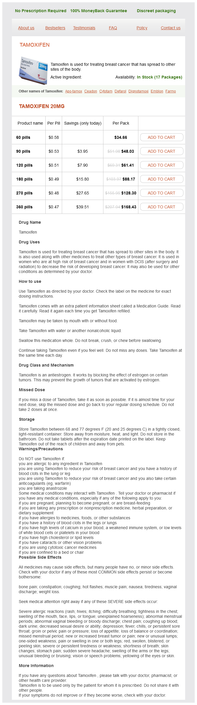 After injection orbital compression for 10 to 15 minutes is applied with superpinky or any other method pregnancy years after vasectomy discount 20 mg tamoxifen otc. The anaesthetic solution used for peribulbar anaesthesia consists of a mixture of 2% lignocaine, and 0. During general anaesthesia for ocular surgery, use of relaxants, endotracheal intubation and controlled respiration is preferred. Lid speculums non co-operative and mentally retarded adults, perforating ocular injuries, major operations like. It retracts the lids and its solid blades keep the lashes away from the field of operation. Uses: It is used to hold the superior rectus muscle while passing a bridle suture under it; to stabilize the eyeball during any operation such as cataract surgery, glaucoma surgery, corneal surgery, etc. Eye speculums are used to keep the lids apart during: · Intraocular operations such as cataract surgery, glaucoma surgery and keratoplasty. Use: these are used to hold the cornea or scleral edge (of incision) for suturing during cataract, glaucoma, repair of corneal and/or scleral tears and keratoplasty operations. Use: these are used to catch the iris for the purpose of iridectomy during operations for cataract, glaucoma, optical iridectomy and excision for iris prolapse, tumours and entangled foreign bodies. It is applied near the limbus to hold the conjunctiva and episcleral tissue together. Uses: these are used to epilate the cilia in trichiasis and stye, to remove cilia after electrolysis and cryolysis and to remove cilia lodged in the punctum. It has multiple straight grooves (at right angle to the limbs) near the tip and a locking mechanism near the ringed end. The small-sized artery forceps, also called as mosquito artery forceps are more commonly used in ophthalmology. Uses: (i) To catch the bleeding vessels during operations of the lids and lacrimal sac. Use: It is used to retract the lids during examination of the eyeball in cases of blepharospasm in children, in cases with marked swelling and ecchymosis, removal of corneoscleral sutures, removal of corneal foreign body and for double eversion of upper lid to examine the superior fornix. It is made up of two limbs with three curved pins on each for engaging the edges of the skin incision. It consists of a handle with a curved blade (which conforms to the pupillary margin) at one end. Use: It is used to take measurements during squint, ptosis, retinal detachment and pars plana vitrectomy surgery. These are available in various sizes with straight or curved tips, in different shapes and may be with or without locking system. The jaws of the needle holder are finely serrated to hold the fine needles firmly. Use: Spring type needle holders are used for passing sutures in the conjunctiva, cornea, sclera and extraocular muscles. It is a long, narrow, thin and straight blade with a sharp tip and cutting edge on one side. Uses: (i) Previously, it was used for making an abinterno corneoscleral incision during cataract surgery and for iridectomy operation. These are large needle holders and all are of similar type with slight model differences. Use: these are very commonly used in lid surgery and also for passing superior rectus suture. Use: Keratomes are used to make valvular corneal incisions for entry into the anterior chamber for all modern techniques of cataract extraction viz. It is a divider- shaped needle with sharp cutting edges resembling in appearance to a small keratome. It has a short flat blade with a semicircular blunt dissecting edge, which is bevelled on both the surfaces like a chisel. Uses: (i) It can be used to separate the conjunctiva and sub conjunctival tissue from the sclera and limbus when limbal based flap is made for trabeculectomy surgery. Presently, presterilized razor blade fragments mounted on a disposable plastic handle. Use: It is the most commonly used cutting device for making incisions in cataract, glaucoma, keratoplasty, sclerotomy, pterygium and many other operations. It is used to make a small valvular clear corneal incision (commonly called as side port incision) in phacoemulsification and other intraocular surgeries including pars plana vitrectomy. It is a fine straight but triangular knife similar to 15° side port entry blade but with cutting edges on both sides. Its blade is curved and either mounted on a plastic handle (disposable) or can be fixed with metallic handle. Presently, disposable cystitome is prepared by bending the disposable 26 gauge or 30 gauge hypodermic needle. Use: It is used for doing anterior capsulotomy or capsulorhexis during extracapsular cataract extraction. Use: It is used to cut and undermine conjunctiva in various operations and to undermine skin during operations on lids and lacrimal sac. Use: It is used to perform iridectomy, iridotomy and to cut the prolapsed form vitreous and pupillary membrane. Use: They are used as a handy alternative to plain straight and plain curved ringed scissors for cutting and undermining conjunctiva in various operations and to cut sutures. Uses: (i) these are used to enlarge corneal or corneoscleral incision for conventional intra capsular and extra capsular cataract extraction techniques (sparingly performed procedures nowadays) of cataract surgery. Uses: (i) these are used for cutting anterior capsule of the lens in extra capsular surgery and for cutting 100 nylon sutures. They are large, stout and strong scissors having curved sharp blades with blunt ends.