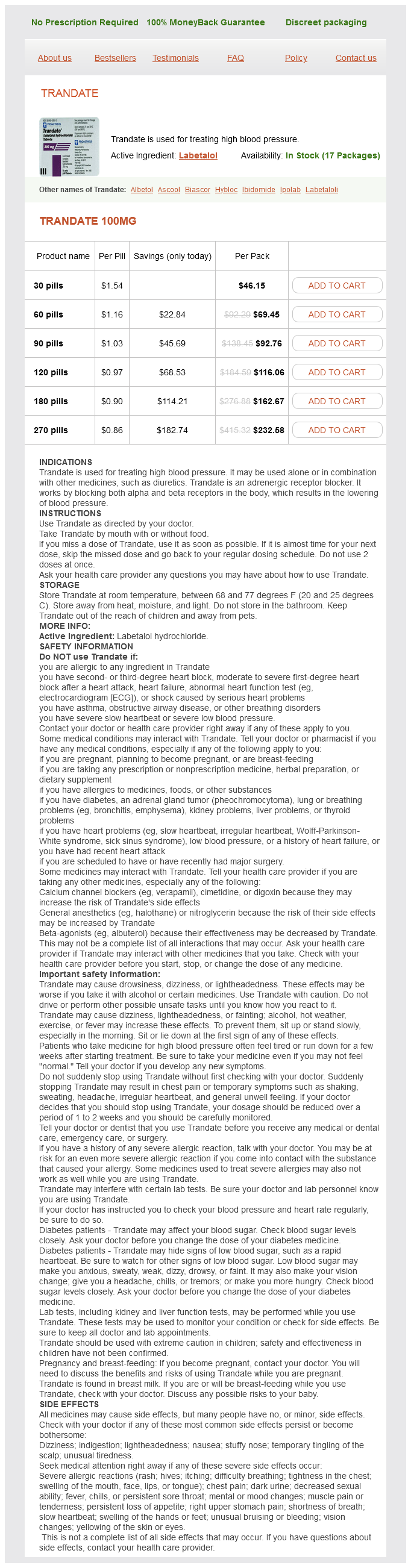 Trandate is a medication commonly prescribed for the treatment of hypertension, also referred to as hypertension. It belongs to a class of drugs referred to as beta-blockers, which work by blocking the effects of sure chemical substances in the body that can enhance blood pressure.