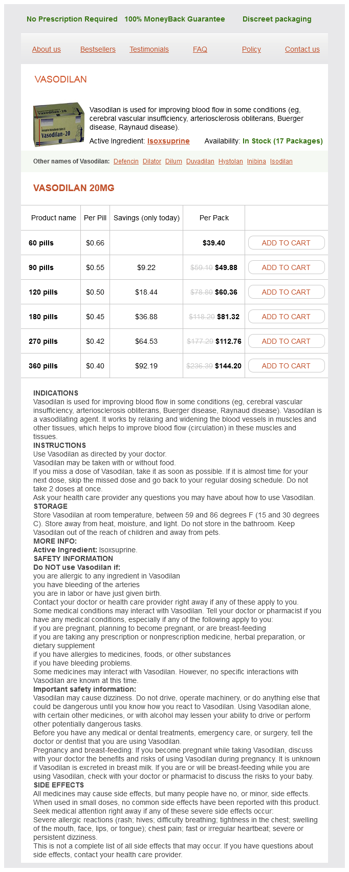 The electrophoretic alpha-globulin pattern of serum in alpha-antitrypsin deficiency pulse pressure meaning cheap 20 mg vasodilan fast delivery. P2X7 receptor signaling in the pathogenesis of smoke-induced lung inflammation and emphysema. Origin, homeostasis and function of Langerhans cells and other langerin-expressing dendritic cells. Anti-tissue antibodies are related to lung function in chronic obstructive pulmonary disease. A novel insight into adaptive immunity in chronic obstructive pulmonary disease: B cell activating factor belonging to the tumor necrosis factor family. Antielastin B-cell and T-cell immunity in patients with chronic obstructive pulmonary disease. Evidence that Langerhans cells in adult pulmonary Langerhans cell histiocytosis are mature dendritic cells: importance of the cytokine microenvironment. Chapter 98 Mucosal Immunity in the Oral Cavity, Upper Respiratory Tract, and Adjacent Areas: An Overview Michael W. The reasons are quite simple: the mouth and its secretion, the saliva, are the most accessible components of the mucosal immune system and can be readily sampled without need for invasive procedures in persons of any age. Indeed, the first experimental demonstration that the common mucosal immune system existed in humans was accomplished by oral immunization with a suspension of Streptococcus mutans, revealing immunoglobulin (Ig) A antibody responses in saliva and tears but no serum antibodies (Czerkinsky et al. Immunity to oral infections, which include another highly prevalent condition, periodontal disease, continue to afford opportunities for investigating the mucosal immune system and its interface with systemic immunity (Chapter 102). Thus, comprehension of the immune regulatory mechanisms involved and how they are disrupted by periodontal pathogens will likely reveal parallels with other mucosal inflammatory conditions, such as inflammatory bowel disease. Although the precise contribution of the tonsils to the generation of mucosal immune responses and their dissemination to remote effector sites has been controversial, it is clear that these tissues are an active site of induction as well as expression of immune responses, with connections to the systemic and mucosal compartments of immunity. The cellular and molecular mechanisms operating in these tissues are extensively reviewed in Chapter 103. From the pharynx, it is but a short step to the nasal passages in one direction and to the middle ears via the Eustachian tubes in another, and both are sites of significant infectious pathology and immunopathology. For many years, the nose has been regarded by many immunologists as "the part of the lung that you can touch with your fingers. However, as explained in Chapter 100, we now realize that the nose is a distinct mucosal immune site from the lungs, in which there is a much greater effect of vasomotor tone and reflexes. Primary entry of antigens via the nose often leads to tolerance induction, characterized by the induction of regulatory T cells and production of IgA responses to antigens. Because the nose was considered a nonimmunogenic site, this led to the idea that drugs such as insulin could be administered via the nose, avoiding the generation of antibodies. However, it has become clear that the nose is a very active site of immune induction, even to harmless antigens such as insulin, and this route of administration of protein drugs has been virtually abandoned. We now realize in greater detail that immune defense of the nose consists of more than the sneezing reflex and the mucociliary blanket. Subsequently, effector T and B cells return to the nasal mucosa and control innate and adaptive immune responses. The seasonal and perennial forms of this disease are common causes of absenteeism from school and work and have great impact on the quality of life of those affected, even more than asthma. Allergic rhinitis is also a common comorbidity of asthma (80% of cases occur together), affecting the severity of asthma (von Mutius et al. Mouse models of asthma and rhinitis have clearly shown that allergic rhinitis influences the generation of asthma (Hellings et al. Chronic rhinosinusitis with or without polyps is well described in Chapter 100 and represents a highly interesting model of a mucosal disease. In nasal polyps, sometimes a predominance of eosinophils is seen, whereas sometimes neutrophilia is noticed. These distinct forms of the same polyp are influenced by genetics, colonization by Staphylococci, and by prior therapy. Chronic rhinosinusitis is also very often a comorbidity of severe corticosteroid-dependent asthma, particularly in female patients. In these patients, there might be a predominant role of type 2 innate lymphocytes, identifying this disease as one of the first in which such cells seem to play a predominant role. Relatively little is known or reported on the detailed immunology of the ear and Eustachian tube (Chapter 101). Part of the problem is that this organ is very inaccessible in humans and there are only sparse studies reported in animal models of disease. One of the most common diseases is serous otitis media, possibly a dysbiosis of the middle ear. Much is yet to be learned about the lymphoid drainage and precise immune cell types in the middle ear. Animal models for the precise study of the immune response in the ear are also greatly needed. We know a lot about the organogenesis of the ear, as well as the transcription factors involved, but we have no idea when and where the immune drainage of the ear develops. The eyes have been considered as a site of "immune privilege," implying that a different set of underlying principles operate at least within the interior of the eyeball. However, current understanding of immune regulation has put a different interpretation on the observations that led to this concept. Moreover, as discussed in Chapter 99, corneal antigen-presenting cells function in a similar manner as elsewh