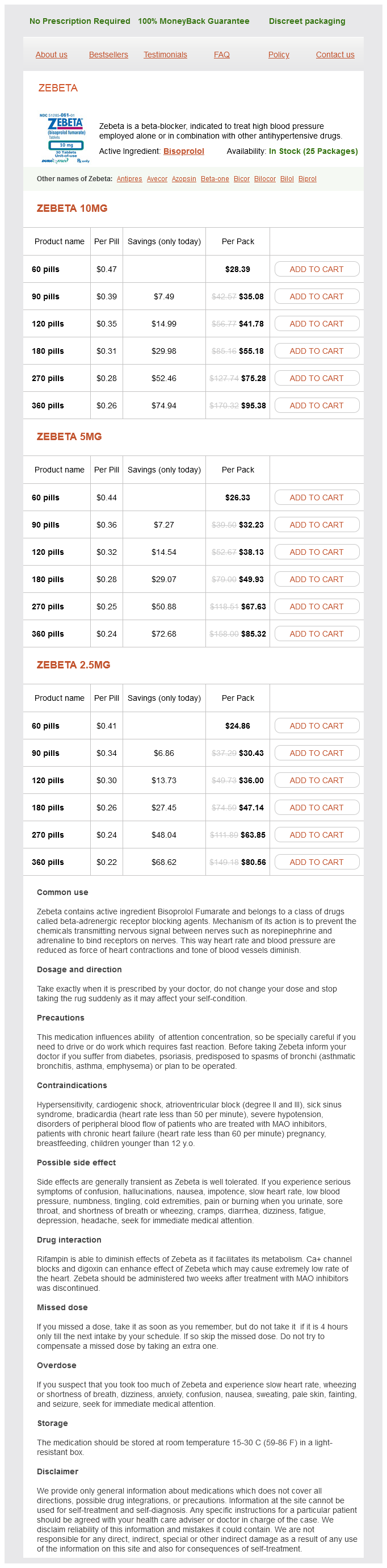 Zebeta, additionally identified by its generic name bisoprolol, is a beta-blocker that works by blocking the action of sure chemical compounds in the body that can improve blood stress and coronary heart rate. This leads to a decrease in blood pressure, making it an effective remedy for hypertension. Zebeta is available as an oral tablet and is usually taken as quickly as a day with or with out food.