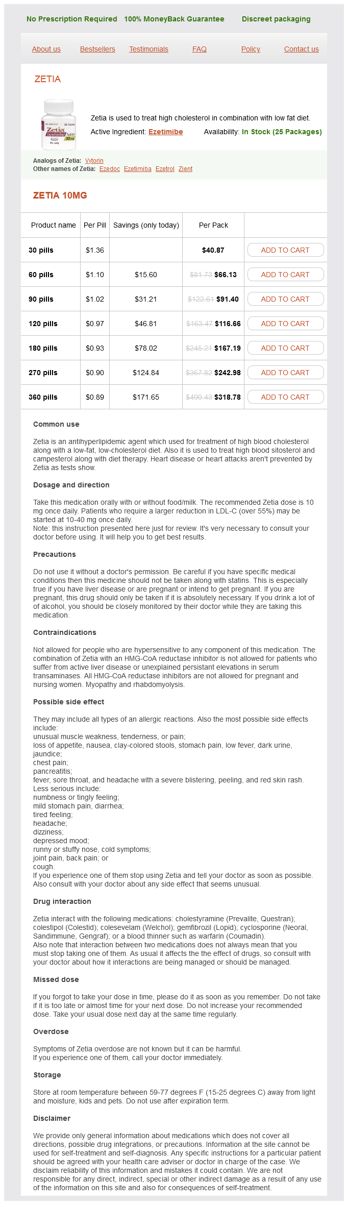For example cholesterol medication guidelines 10 mg zetia purchase fast delivery, when an individual hears a sudden very loud noise, and from his/her experience recognizes it to be bomb blast. In the above example, the person after cognizing the loud sound as bomb blast is frightened; this feeling of frightening is called affect. For example, the desire to run away from the site of loud noise after getting frightened is conation. Physical or expressive or peripheral component Physical or expressive or peripheral component of the emotions is the motor side of emotional behaviour. It consists of two subcomponents-somatic and autonomic: · Somatic part of the physical component of emotions basically comprises changes in the skeletal muscles. The accomplishment of the act of running away from site of noise in the above example constitutes the somatic part of the physical component. For example, occurrence of tachycardia, raised blood pressure, increased respiration rate, etc. Fear (as in the above example) is associated with sympathetic expression which is characterized by an increase in heart rate, increase in respiration rate, cutaneous vasoconstriction, sweating (cold sweat), piloerection, pupillary dilatation and dryness of mouth. In many instances, the somatic part of the physical component of emotions may be absent. For example, after getting insulted and provoked, one may beat the insulter (somatic part present). While the other individual may feel enraged, develop high blood pressure plus tachycardia but restrains oneself and does not show any somatic side of expression (indeed, this is common in civilized societies). It involves: · General arousal, which prepares the organism as a whole for action and · Specific arousal, which prepares the organism for a particular behaviour. For example, sexual arousal involves: - General arousal in the form of tachycardia that prepares for physical exertion and - Specific arousal in the form of tumescence. Theories of genesis of emotions Physical changes are secondary to emotional feelings or vice versa have been the matter of debate. Following theories have been put forward from time to time in this regard; the genesis of emotions as explained by Arnold is as under: Arnold theory. A feeling is thus generated consciously in response to unconscious evaluation of a situation. Therefore, in response to a particular situation, different individuals react differently. Physiological basis of most emotional behaviours has been studied extensively in animals and little bit in humans. Some of the emotional behaviours are: · Rage, fear and placidity (see page 959), · Sexual behaviour (see page 1084) and · Feeling of reward and punishment (see page 1089). Cerebral cortex, especially the frontal, cingulate, and parahippocampal cortices, plays an important role in affective component of emotions: · Detailed processing of conscious experience of emotional feeling occurs in cerebral cortex. For example, once we know that an explosive sound came from only a fire cracker, the fear subsides by cortical suppression of reflex emotional responses. Lesions of cerebral cortex concerned with emotions are associated with emotional disturbances as: · Lesions of orbitofrontal cortex reduce the normal aggressiveness and emotional responsiveness. However, when they are shown emotionally disturbing pictures, they fail to show the expected autonomic response to these emotionally charged stimuli. Such patients experience pain as a sensation and exhibit appropriate autonomic reactions, but the sensation is not perceived as intensely unpleasant. Hypothalamus and other components of limbic system are intimately concerned with physiology of emotions. However, their role as neural substrates of emotions is described below even at the cost of repetition. The output of the peripheral autonomic nervous system produces the manifestation of emotional expressions. Salient anatomical and functional features of amygdala are described on page 1085. As far as emotions are concerned, the amygdala coordinates the affective component of emotions (function of cerebral cortex) with the autonomic response to emotions (function of hypothalamus). Affective component of the emotions is influenced by amygdala through the ventral amygdalofugal pathway that projects from the central nucleus of amygdala to the brainstem, the dorsal medial nucleus of thalamus and the association areas of cortex, especially the rostral cingulate gyrus of the cortex and the orbitofrontal cortex. Peripheral component of emotions is influenced by amygdala through the stria terminalis that projects from the central nucleus of amygdala to: · Hypothalamus, which mediates neuroendocrinal response to fearful and stressful stimuli, and · Nucleus accumbens that controls the body language in emotional states. Various anatomical projections from the central nucleus of amygdala, neuroendocrinal response and the peripheral signs of emotions produced are summarized in Table 10. Role of peripheral nervous system Autonomic as well as somatic motor peripheral nervous system is involved in the peripheral expression of the emotions. There is some degree of specificity in the pattern of autonomic expressions depending upon the type of emotion in question and also whether the autonomic response is primary, i. Cannon described the emotional response to an emergency or involving diffuse sympathetic activation and outpouring into the blood of excitatory substances, i. Somatic motor nervous system is involved in the somatic part of the physical component of emotions, which basically comprises changes in skeletal muscles. Physiology of motivation Motivation is that component of behaviour which is responsible for accomplishing a particular task. Neural mechanism of motivation Neural mechanisms involved in motivation are based on the concept of reward and punishment.