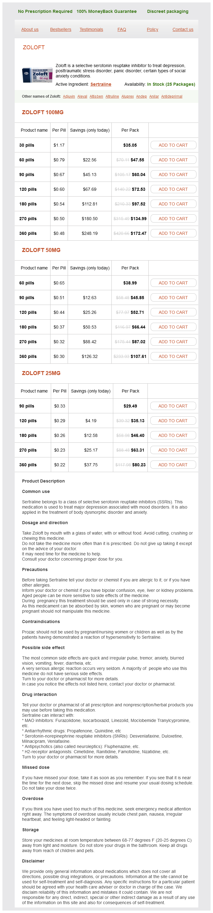 Additionally, Zoloft could interact with other medicines, so it is essential to inform your physician of all drugs you're at present taking earlier than starting Zoloft. It can additionally be important to follow the beneficial dosage and to not stop taking Zoloft with out consulting your healthcare supplier first, as sudden discontinuation can cause withdrawal signs.