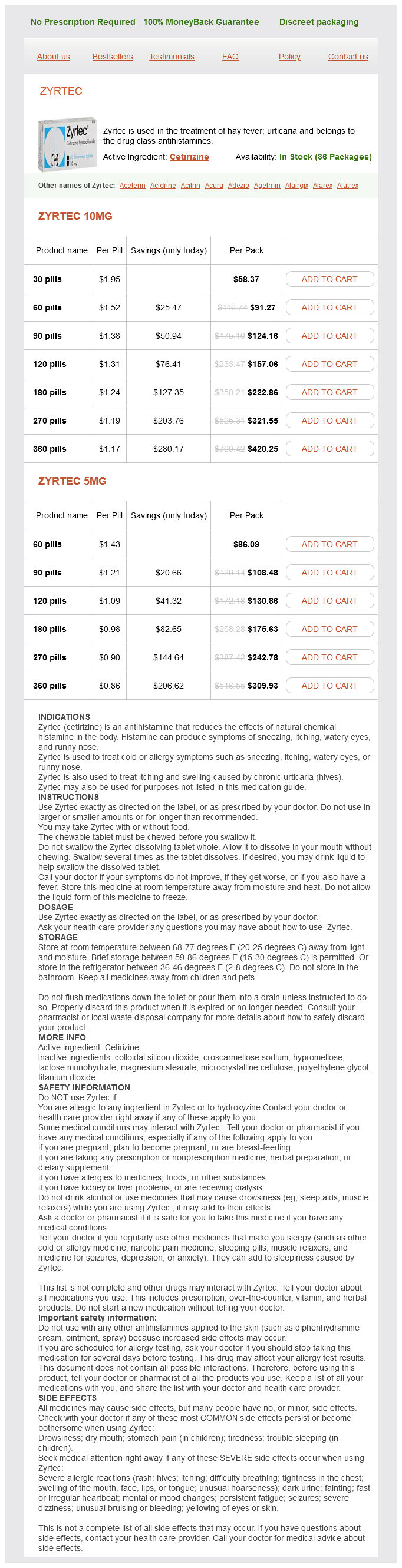 Zyrtec, additionally known by its generic name cetirizine, is a popular antihistamine treatment used to treat hay fever and hives. Hay fever, also recognized as allergic rhinitis, is a standard situation during which the immune system overreacts to allergens in the air, inflicting symptoms similar to sneezing, itching, and a runny nostril. Hives, also known as urticaria, is a skin situation characterized by itchy, raised welts on the skin. Zyrtec is a highly efficient medication in relieving the signs of these situations and has been broadly used for many years.